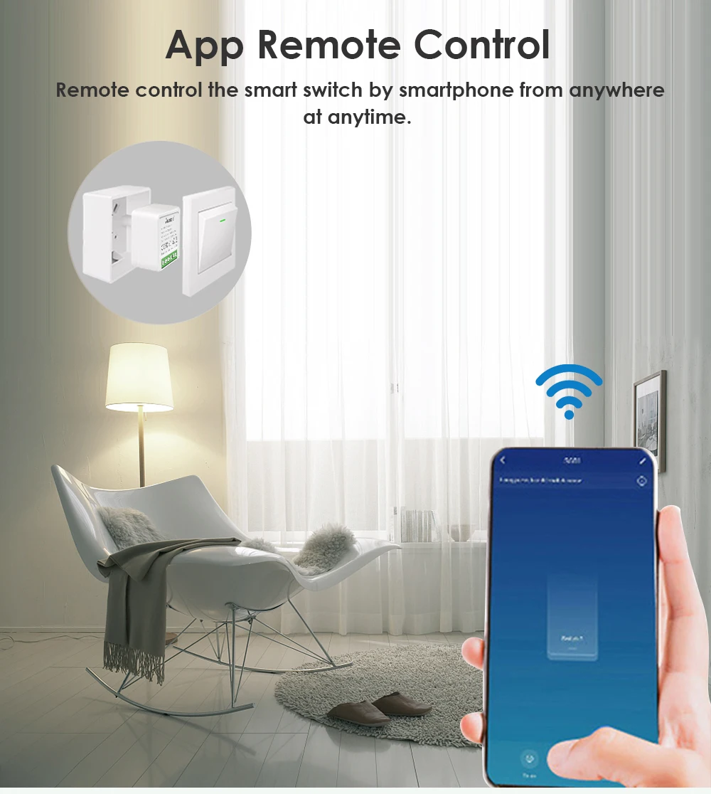 Управляйте включением и выключением устройства, синхронизацией, обратным отсчетом и другими функциями через мобильный телефон. Пока мобильный телефон имеет сеть, модуль переключателя дома можно контролировать по всему миру.