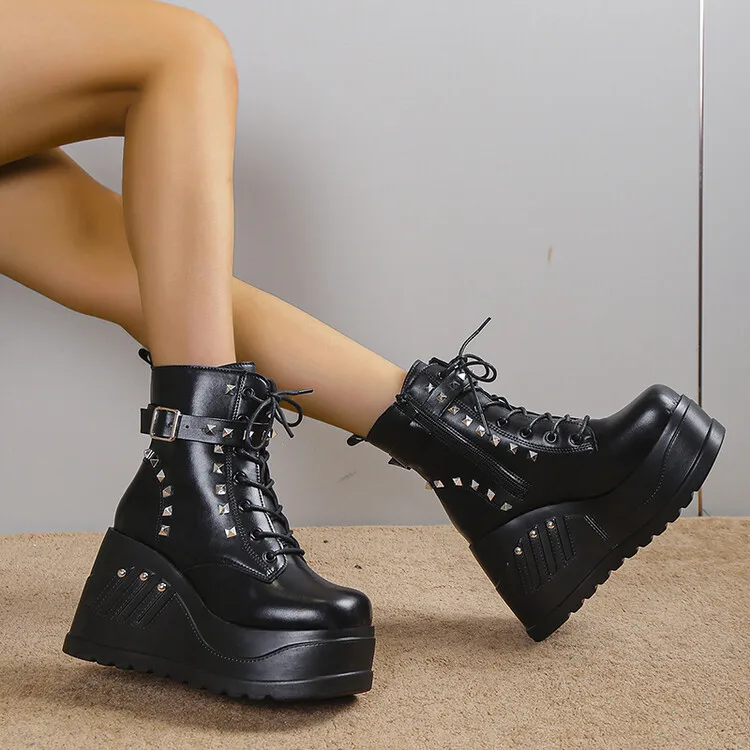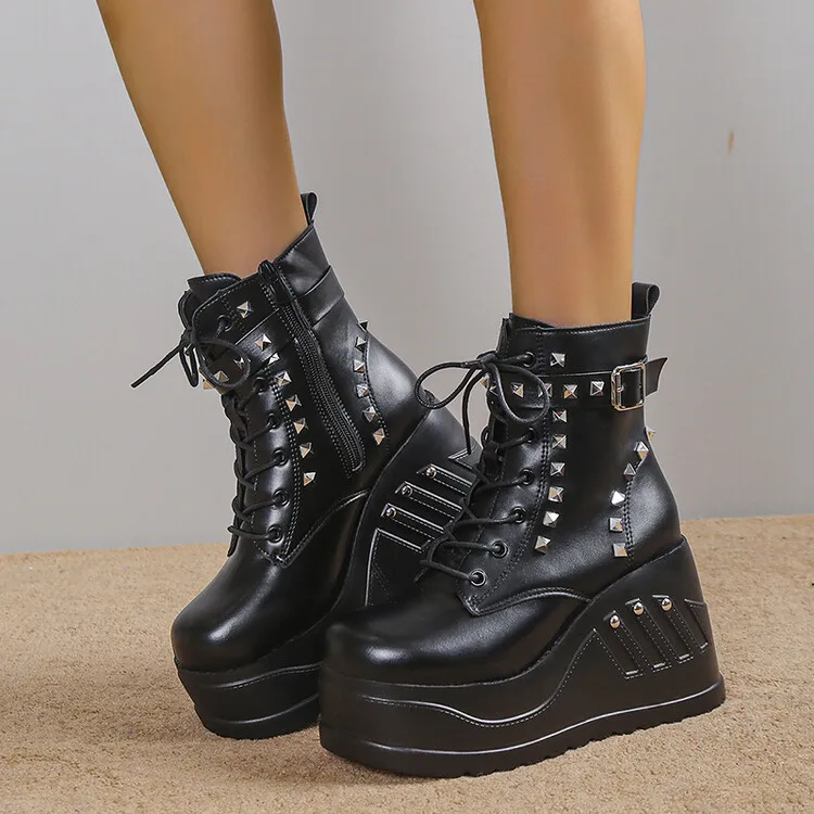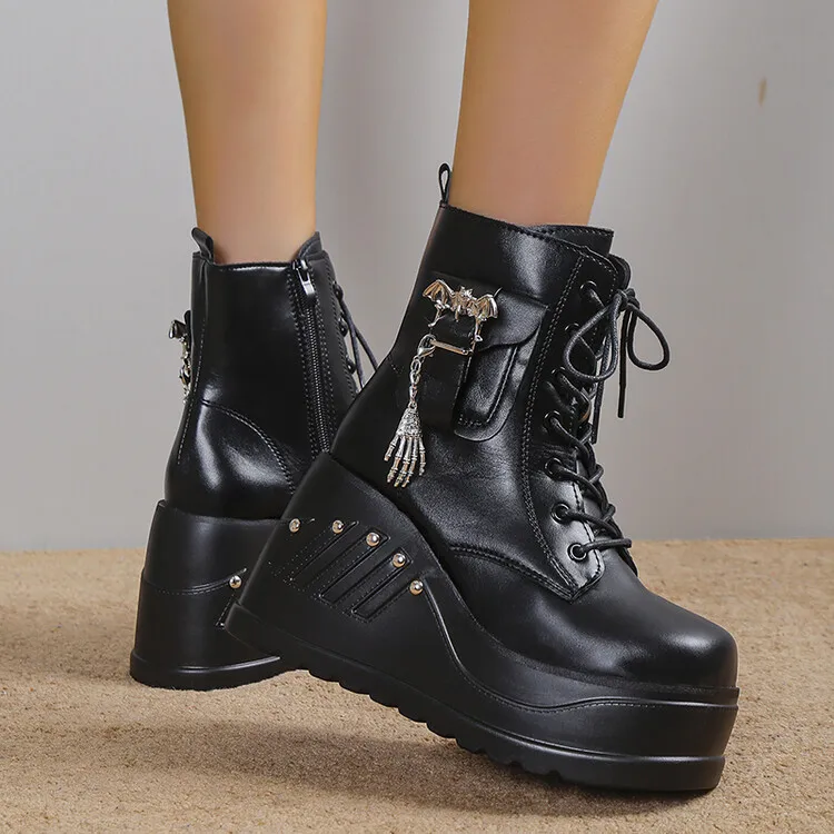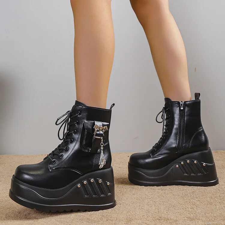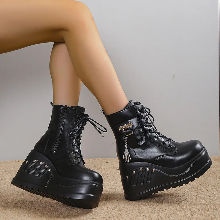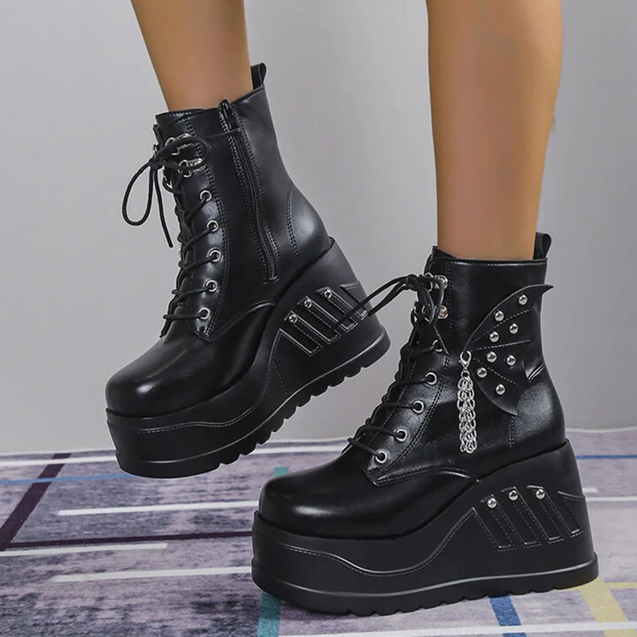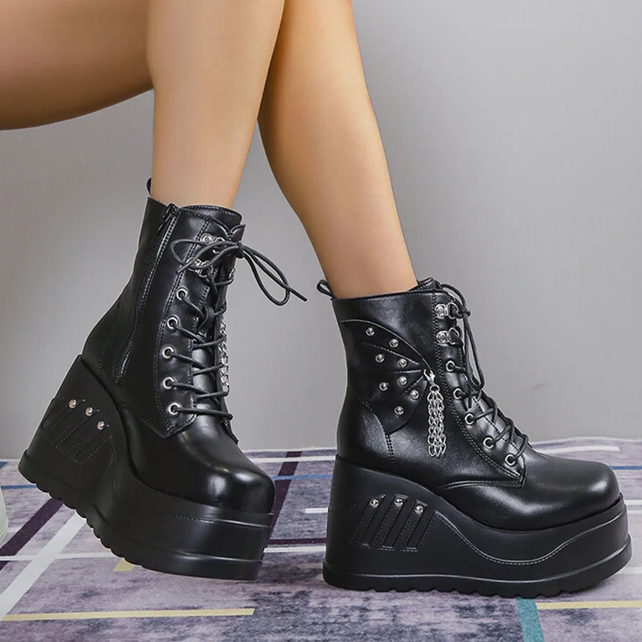 Women Boots Punk Goth Platform Motorcycle Wedges Lace Up Trendy Chain Rivit Stylish 2022 Casual Cosplay Luxury Women's Shoes