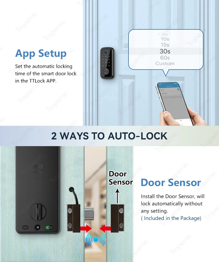 ★【Умный замок безопасности 】вы можете проверить разблокировку записи через приложение, чтобы узнать, когда ваши дети приходят домой, и когда ваша семья забывает закрыть дверь, блокировка smart gate без ключа автоматически блокируется для защиты безопасности вашей семьи. (Может быть 5s, 10s, 30s, 60s или пользовательских секунд)