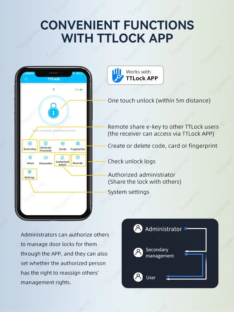 Приложение TTLock с режимом идентификации, отпечатком пальца, картой, кодом и Bluetooth