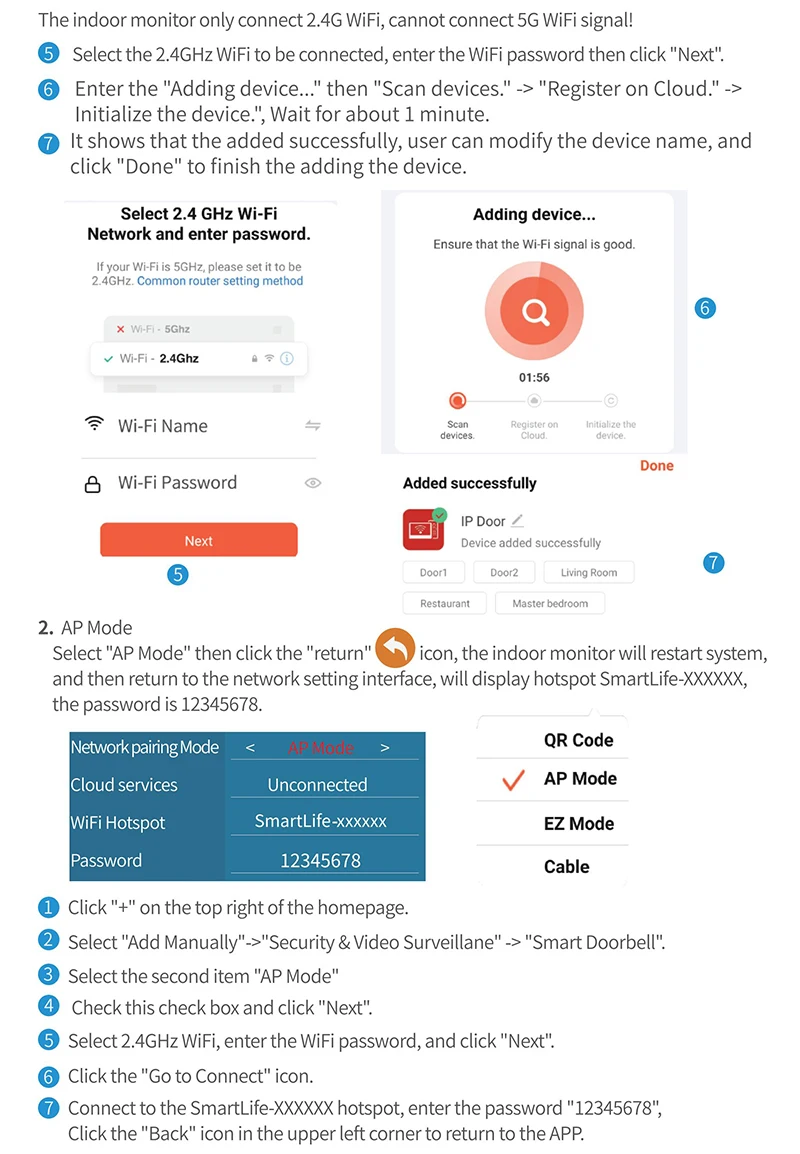 WI-FI видеодомофон система не означает, что вам не нужно провода кабеля. Монитор поддерживает WI-FI сети (только для подключения с 2,4 ГГц маршрутизатор band), но внутренний монитор и дверной звонок проводной.