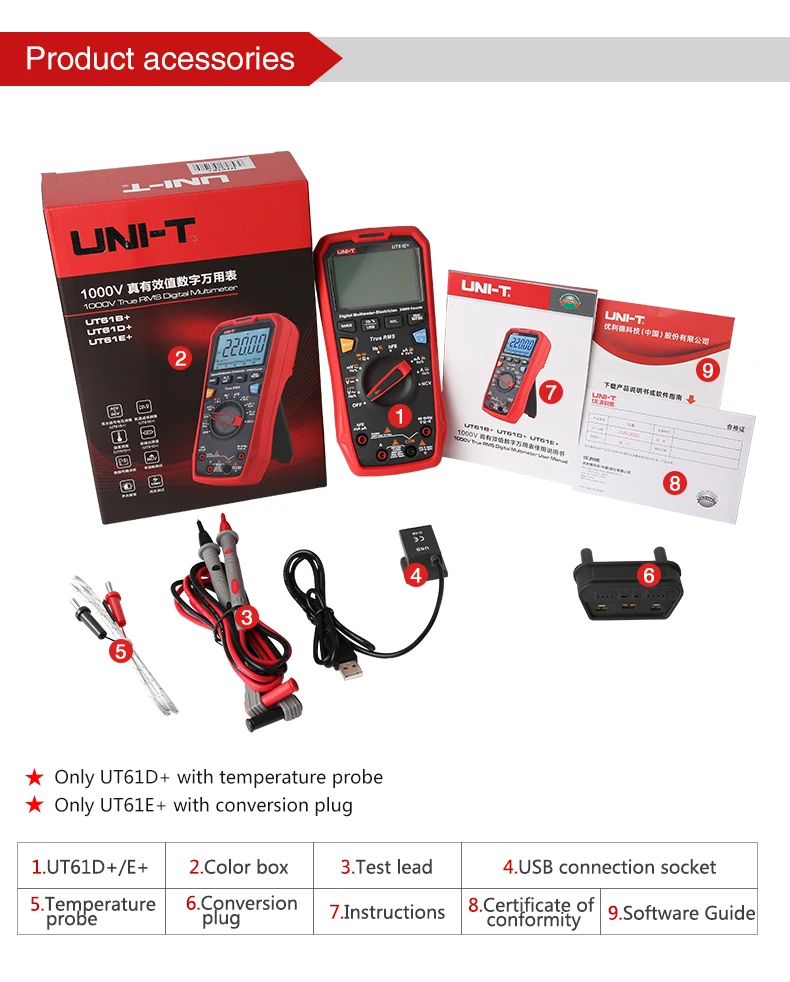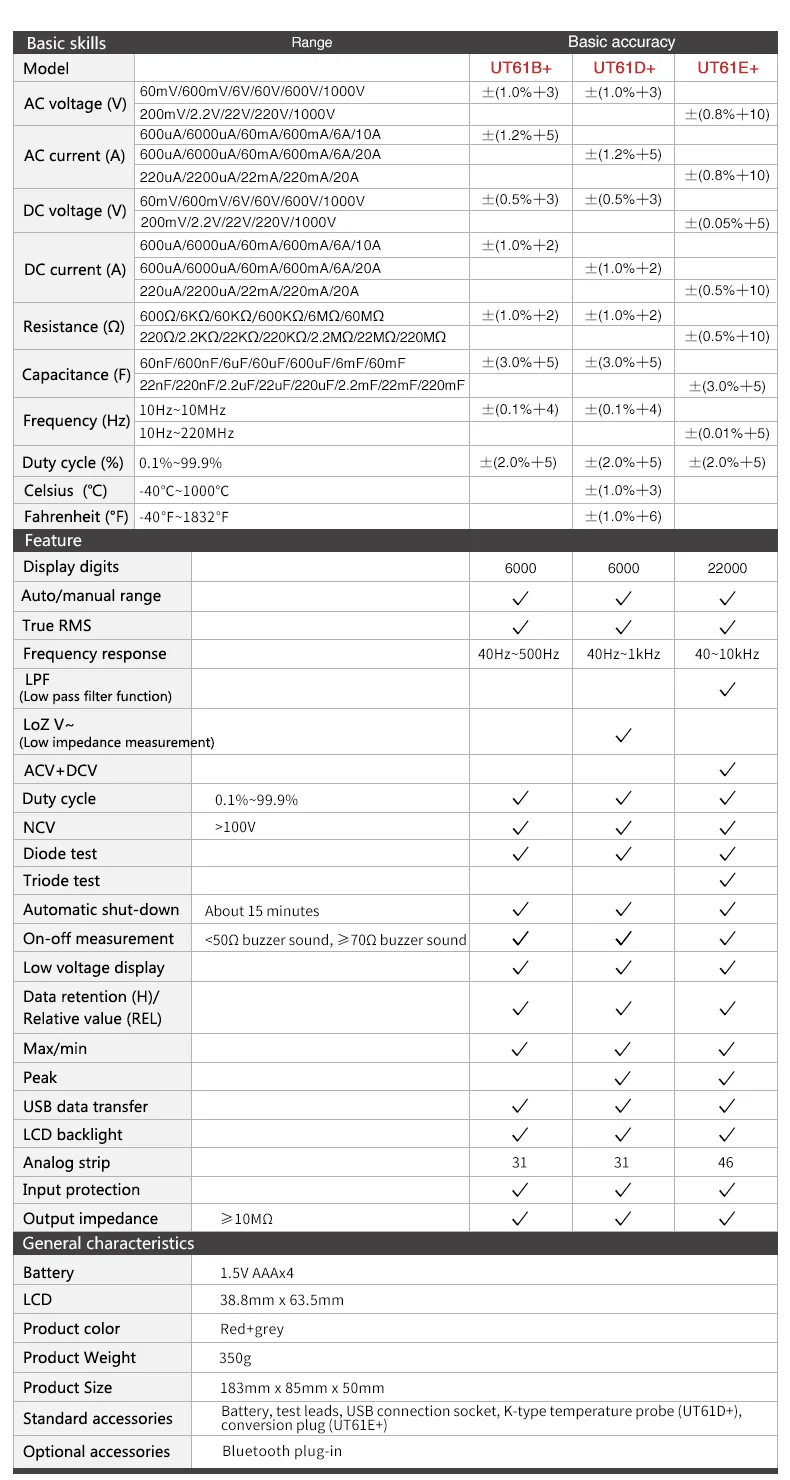 Серия UT61 +-это надежные цифровые мультиметры с истинным среднеквадратичным значением с отсчетом дисплеев 6000(UT61B +/D +) и 22000 (UT61E +). Он может измерять напряжение до 1000 В переменного/постоянного тока и разработан с рейтингом безопасности CAT III 1000 В/CAT IV 600 В. Эта серия также имеет звуковую и визуальную сигнализацию, предупреждения о высоком напряжении/токе и температуре. Его Встроенная панель и функции связи USB могут помочь вам быстро и легко визуализировать результаты neasurement.