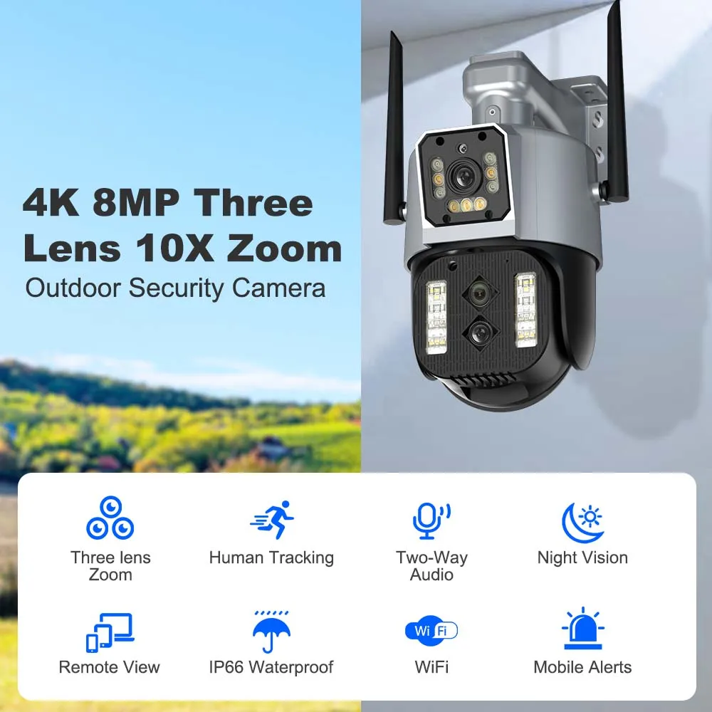 4K 8MP камера безопасности на открытом воздухе, PTZ, три объектива с двумя экранами, 10X оптический зум, 2K 4MP WiFi камера, Ai отслеживание, CCTV видеонаблюдение, бинокулярная IP камера, Двусторонняя аудио-разговор, водонепроницаемый IP66, P2P