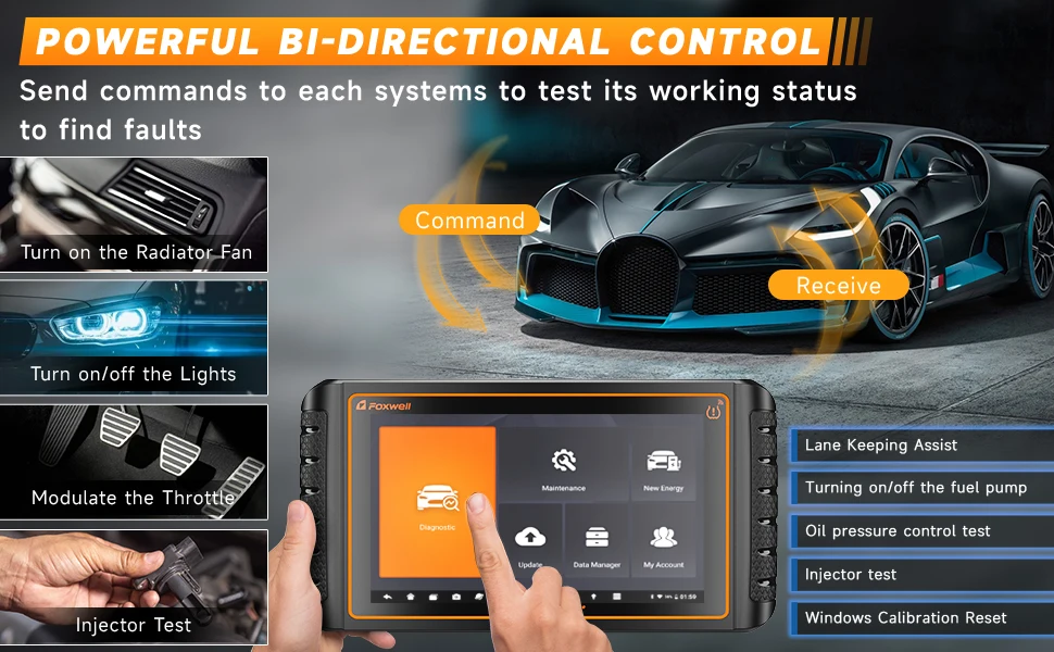 Активный тест (двунаправленный контроль)-диагностический инструмент автомобильного сканера имеет полную двунаправленную способность управления, в основном используется для проверки того, могут ли исполнительные компоненты в электронной системе управления работать нормально. Например: Включите вентилятор радиатора, Модулируйте дроссельную заслонку, открывайте/закрывайте окна, Управляйте зеркалами, проверяйте инжектор, включайте внутренние и внешние огни, звуковой сигнал, тестовые приводы дверного замка и таковые.
