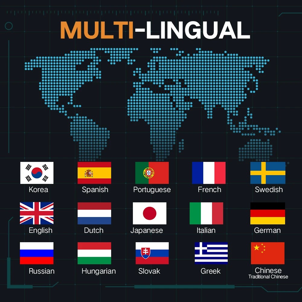 Полные системы диагностики на ECUs: Чтение/стирание кодов, просмотр данных в реальном времени, извлечение информации о версии ECU, активный тест и Сервисные функции для всех систем, включая ECM, TCM, ABS, SRS, BCM, BMS, TPMS, SAS, топливная система, система светильник и система A/C и т. д. с охватом до глобальных моделей автомобилей