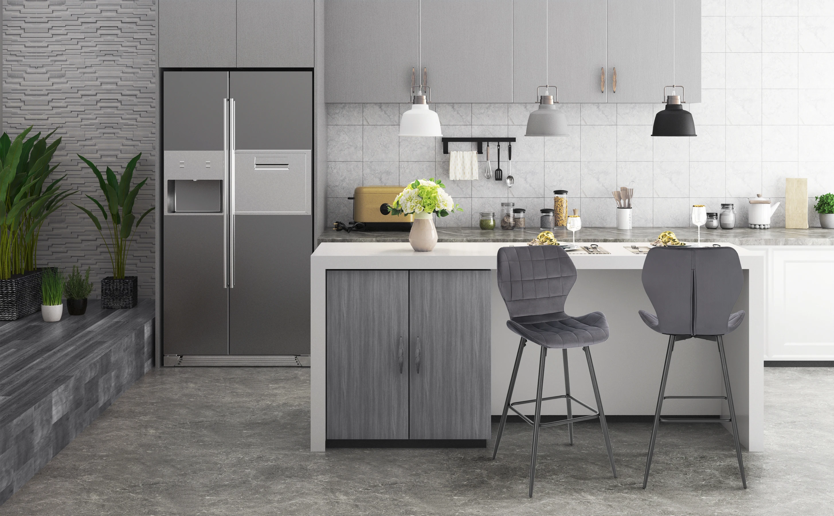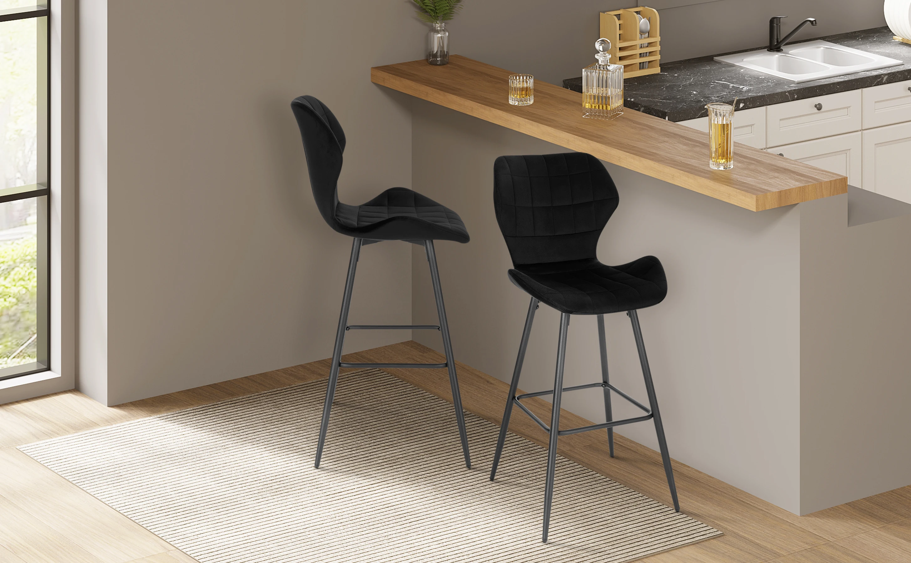 Удобное сиденье: мягкая и шелковистая Бархатная поверхность, пенная подкладка высокой плотности и эргономичная изогнутая спинка позволяют удобно сидеть на этом высоком барном стуле для завтрака или кофе