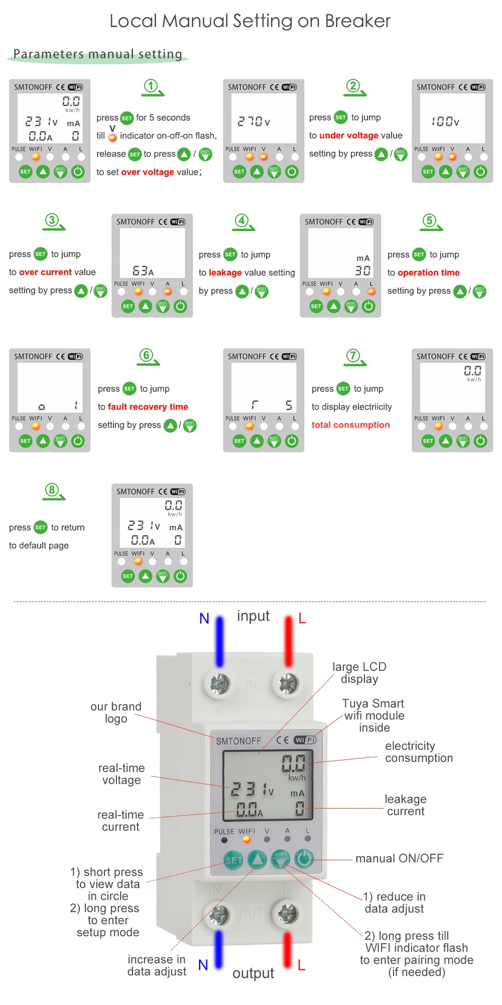 3. Может установить напряжение/под напряжением/над током/ток утечки в приложении или установить их вручную