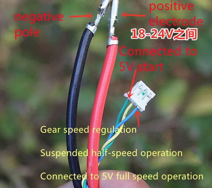 Вентилятор имеет две регулируемые скорости передачи, и проводка проста. Есть пять исходящих линий. Красный положительный и черный негативный подключены к источнику питания постоянного тока, зеленая линия подключена к запуску 5 В, синяя линия не подключена к работе половинной мощности, И синяя линия подключена к полноскоростной работе 5 В