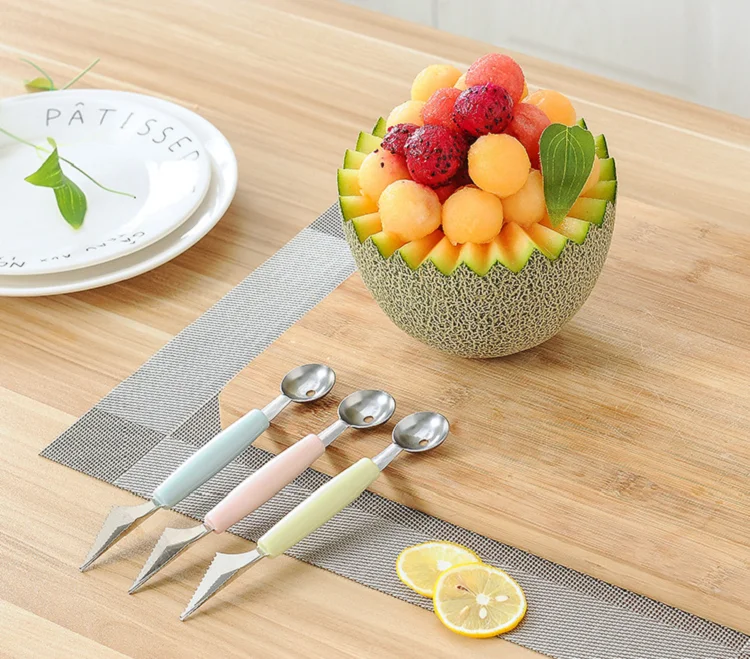 Лучшая помощь для создания и красивых DIY фруктов пластины двойной резки фруктов инструменты, волнистые боковая резная нож, сделать причудливый крой, нержавеющая сталь Сторона копать мяч, мяч может копать фрукты, фрукты легко едят.