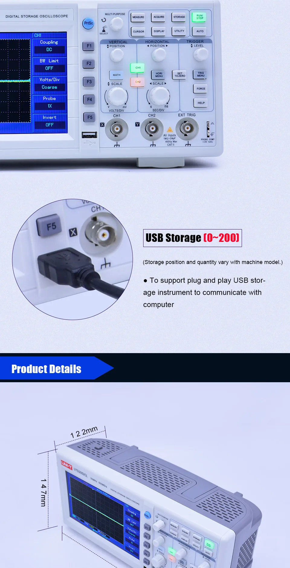 1. Полоса пропускания 25 МГц/50 МГц 2. 250 мс/с or500MS/s частота дискретизации в реальном времени 3. Низкий уровень шума, Широкий вертикальный диапазон: lmV/div ~ 20V/div 4. Обновление программного обеспечения системы с usb-накопителем 5. Автоматическое Измерение 28 параметров формы волны 6. Более 2000 wfms/s скорость захвата сигнала 7. 7-дюймовый TFT LCD, WVGA (400X 240)