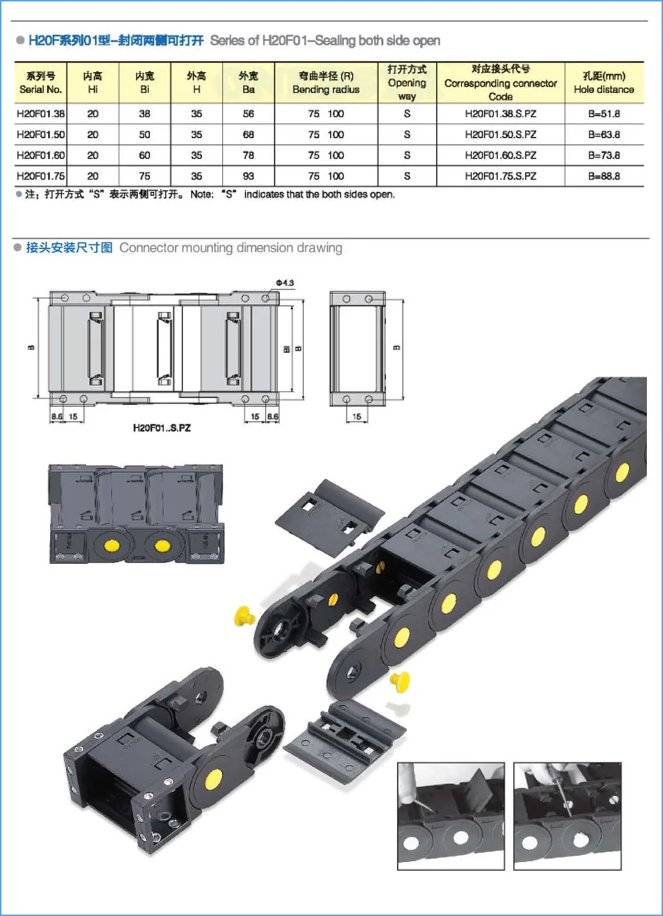 3) цепь блока вокруг плиты цепи и верхний и нижний состав крышки, towline может открыть каждый раздел, легко сборка и разборка без резьбы, к кабелю, трубе, И т. Д. В towline после открытия крышки.