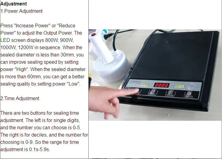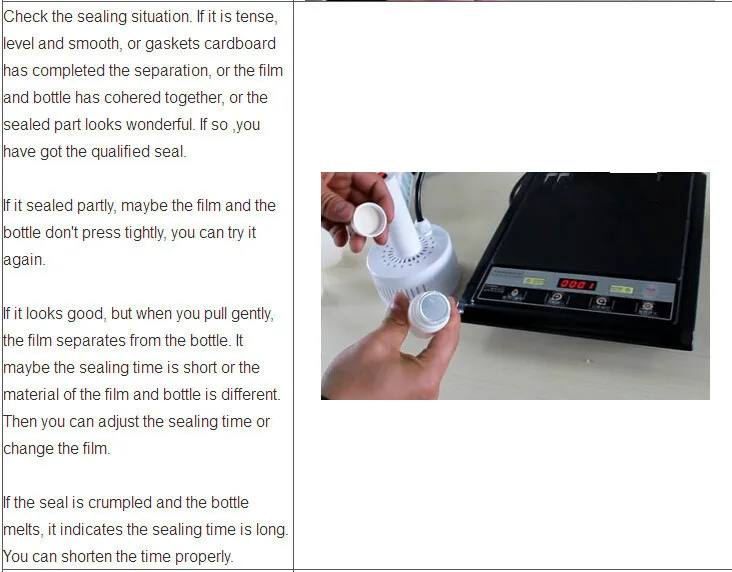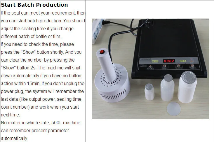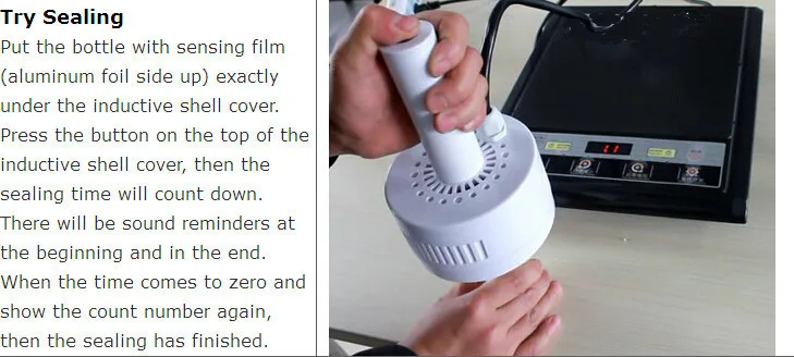 500E is hand-held electromagnetic induction heating apparatus, specializing for the aluminum foil sealing of containers in pharmaceutics, chemical industry, pesticide, foodstuffs, cosmetics and light industry. Containers made of various materials are sealable. With small size, light weight, easy operation, it is suitable for low-volume production and operation in labs. The machine operates on the principle of electromagnetic induction: The aluminum foil on the bottle top is highly heated instantaneously and melted so that the bottle mouth is closely wrapped and sealed. The sealing is damp-proof, mould-proof, forgery-proof and theft-proof and prolongs goods storage time. The containers sealable can be made of PE, PP, PS, PET, ABS, glass, porcelain etc. but not metal. With Japan's latest modular power devices adopted, it is more economized in power and 20~30 times quicker in instantaneous heating than conventional vacuum tube-induced heaters, its heating efficiency being up to more than 90%.