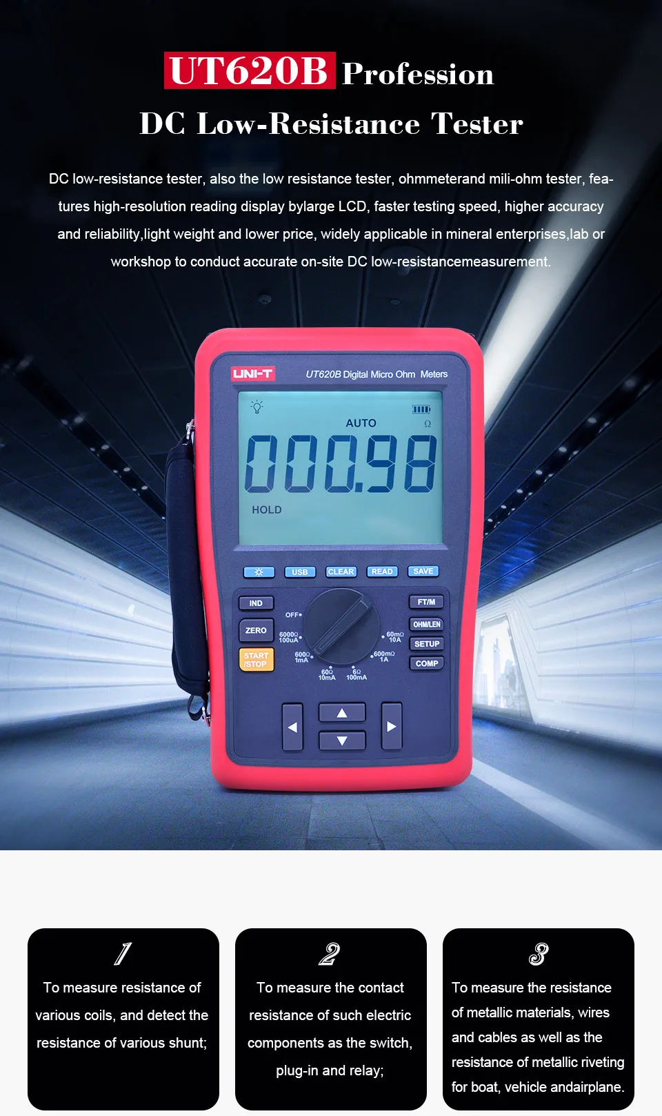 UT620 может использоваться в узком месте для поиска и устранения неисправностей на месте, таких как сопротивление металлическому покрытию/двигатель и измерения сопротивления обмотки маленького трансформатора, соединения системы заземления/сварочные точки/распределительный шкаф питания автобус и свинцовое соединение проверки и многое другое.