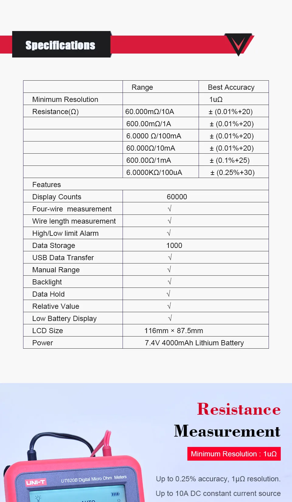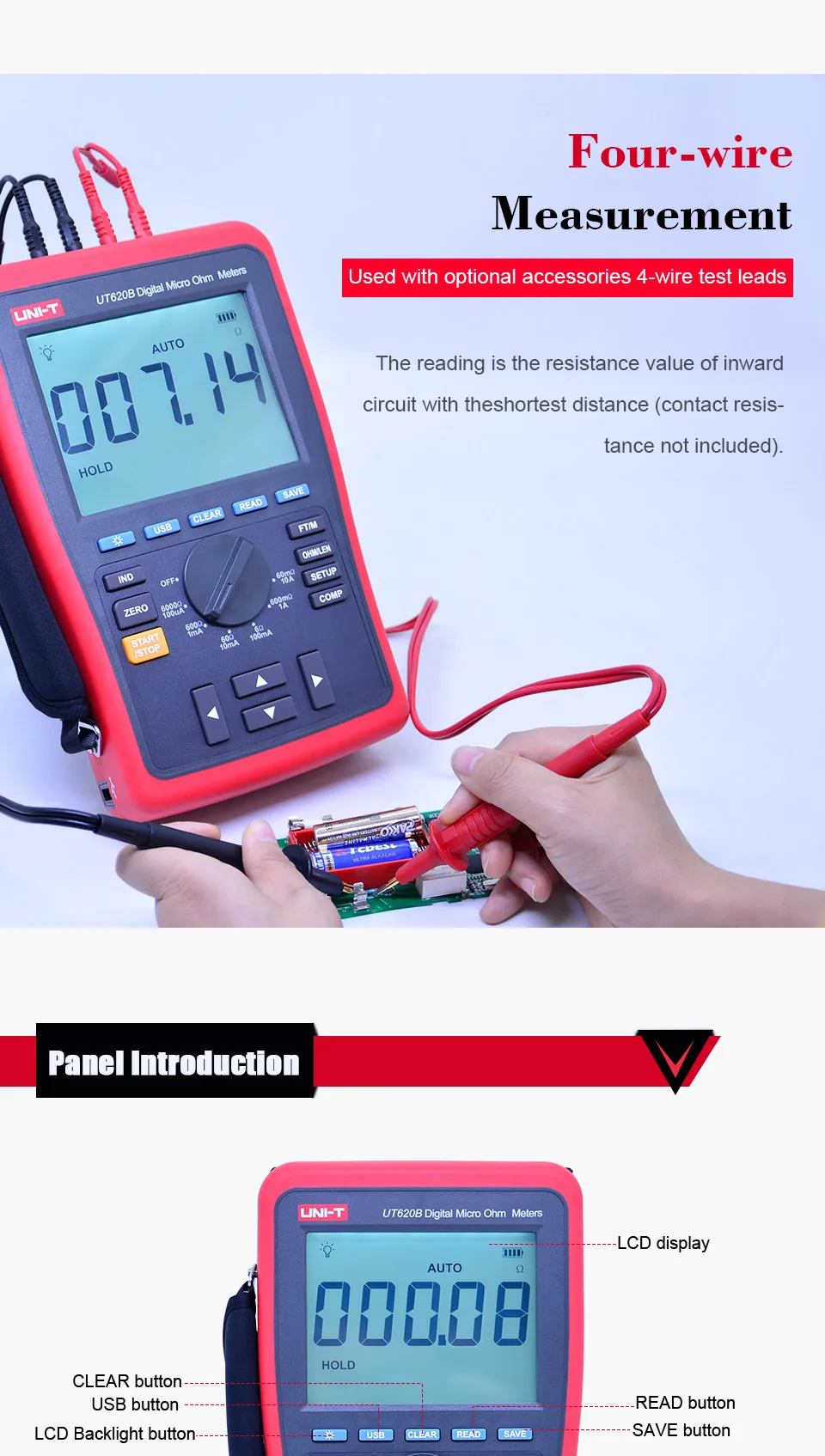 UT620 серии используются для измерения напряжения постоянного тока с низким сопротивлением через 4-методом провода. Какие-то свои особенности: Функция сравнения для того, чтобы определить в том случае, если устройство находится в хорошем состоянии, неизвестный длина провода расчет (футы/м); Двухсторонней передачи данных по интерфейсу USB; встроенный литий-ионная аккумуляторная батарея.