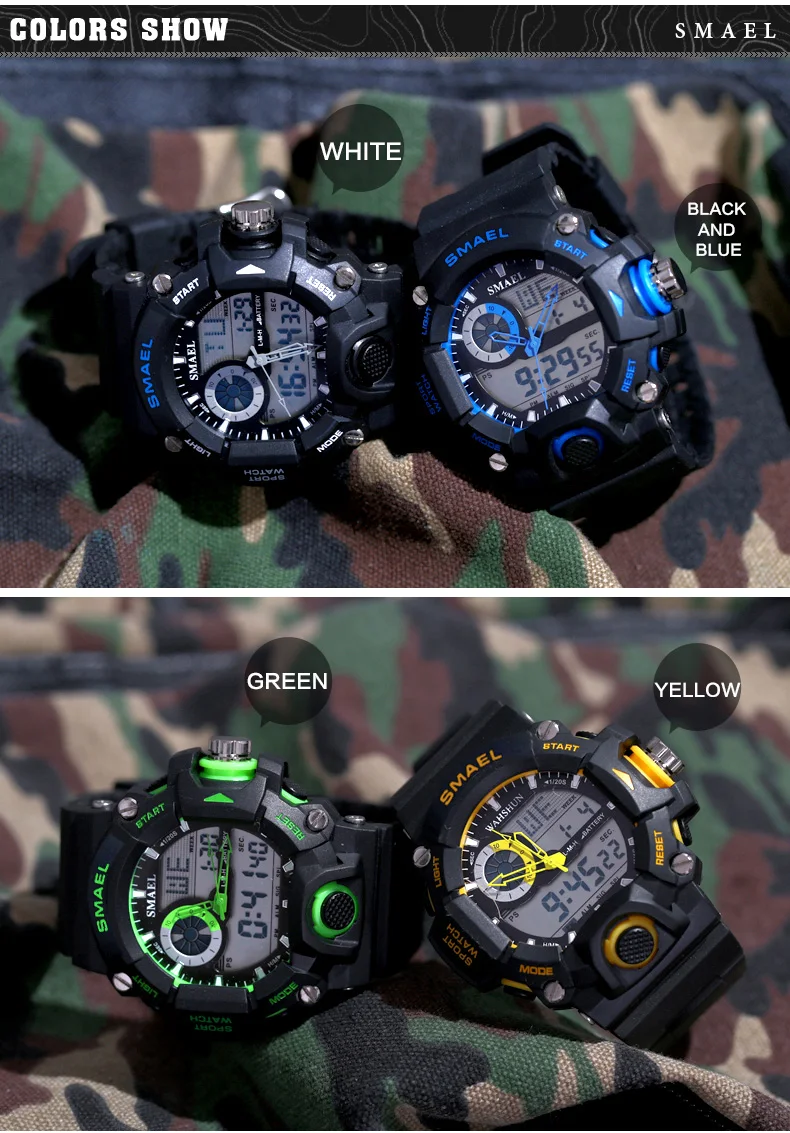 Часы SMALE S Shock оснащены простым светодиодом с гигантским циферблатом сбоку. Существует двойной дисплей времени обоих типов, аналоговый и цифровой. Часы доступны в различных цветах: красный, черный, оранжевый, синий, зеленый и желтый. Вы можете носить его в любом месте, даже когда вы собираетесь плавать, горные прогулки, кемпинг или играть на пляже. Часы S Shock имеют резиновые чехлы и руки. Они также имеют кварцевый механизм и минеральное Кристальное окно. Эти часы водостойкие и отличаются друг от друга только по типу дисплея, весу, размеру и диаметру.