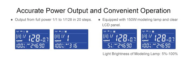 1. Стабильный режим цветовой температуры: 5600K +/-200K 2. Высокоскоростная вспышка (скорость) режим: 5400K ~ 9000K 3. Высокоскоростной режим синхронизации: 4600K ~ 5000K Радио 2,4G беспроволочная передача: Беспроволочная функция: рабочий блок, ВКЛ/ВЫКЛ Управляемые рабочие элементы: 16 групп Диапазон действия тансмиссии: прибл. 50 м Канал: 32 Синхронизации Trigging режим: 3,5 мм Линия синхронизации, с синхронизацией с компьютером, Беспроводной Управление Порты и разъёмы Размеры: диаметр вспышки µ1414 см, высота 23 см с ручкой, длина 41 см с крышкой лампы Вес нетто: 2,96 кг