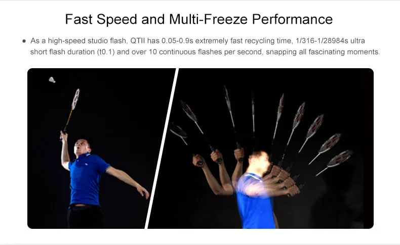 Высокоскоростной стробоскопический светильник Godox QT600II 600WS имеет комплексное обновление от первого поколения QT600 с изысканным дизайном, передовой техникой и множеством функций, благодаря встроенной беспроводной системе управления Godox 2,4G обеспечивает удобное Беспроводное управление и высокоскоростную вспышку, чтобы запечатлеть прекрасный момент. Беспроводное управление питанием и система запуска вспышки, полная поддержка высокоскоростной синхронизации 1/8000s, мульти вспышка, задержка вспышки, функция маски, S1/S2 оптический запуск, C.Fn Customfunction и т. Д. В качестве высокоскоростная студийная вспышка, QTII имеет 0,05-0,9 s очень быстро время перезарядки, 1/316-1/28984s ultra short Throw длительностью вспышки (t0.1) и более 10 непрерывных вспышек в секунду, захватывает все захватывающие моменты. Поддержка slave блок беспроводного управления Godox TTL flash, который Встроенный 2,4G беспроводной X1 системы, такие как: Godox TT685C TT685N TT685S V860IIC V860IIN V860IIS AD600BM AD600M AD360IIC AD360IIC вспышка, светильник он также беспроводной Запуск X1T-C,X1T-N,X1T-S Беспроводной TTL триггерный передатчик Точная выходная мощность и удобная работа, выход от полной мощности 1/1 до 1/128 за 20 шагов. Оснащен модельной лампой 150 Вт и прозрачной ЖК-панелью. Светильник с яркостью моделирующей лампы: 5%-100% Описание продукта:
