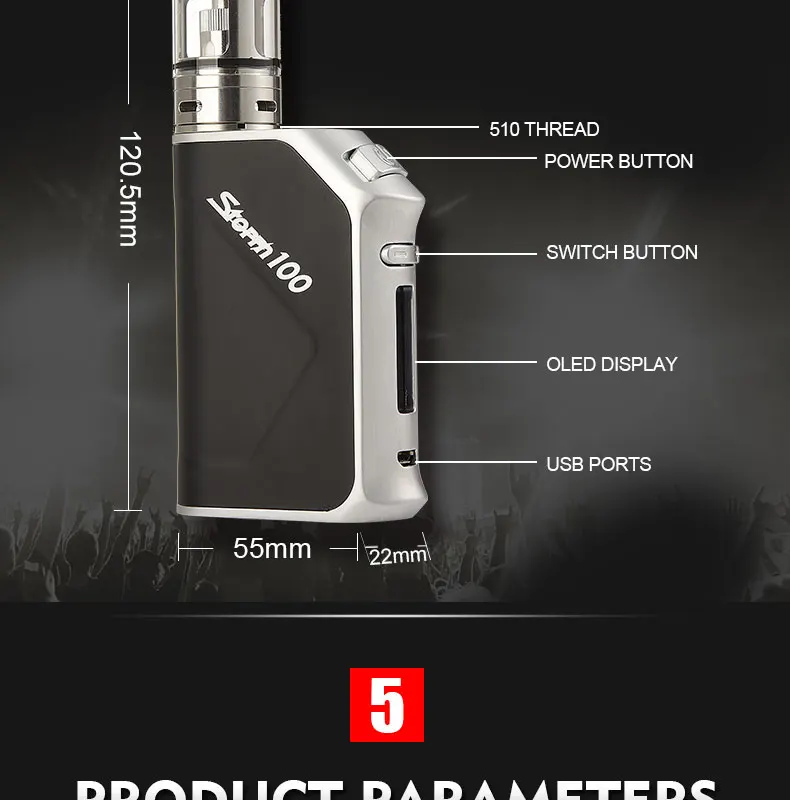 Мощный, но более умный, новый Vapor Storm S100W Умело разработан с Новейшая система контроля температуры. Встроенные двойные полимерные элементы, обеспечивают большую емкость 3200 мАч, Обновленная версия Vapor Storm 50 Вт, самая главная точка заключается в том, что это устройство поддерживает быструю работу 3 А Зарядного устройства с функцией быстрой зарядки и скорость зарядки будет стандартный 2,0 раз в теории достаточно В течение 1 часа для полной зарядки (но, пожалуйста, используйте зарядное устройство 3A), кроме того, эргономичный дизайн Форма со скрытой кнопкой для лучшего захвата.