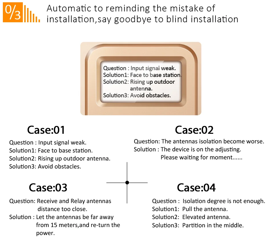 Note : Please be sure the place where you are going to install is DCS1800MHz WCDMA 2100MHz And make sure you can get at least 2 bars 2G and 4G signal of outdoor before you buy, otherwise this product can’t help you. It needs outdoor good signal to improve your indoor signal.