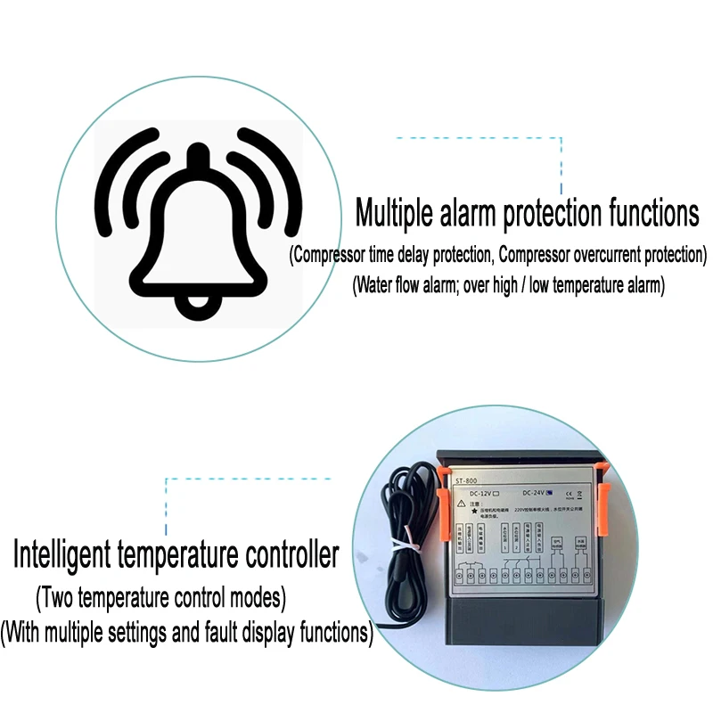 5. Несколько функций сигнализации: защита от задержки компрессора, защита от перегрузки по току компрессора, сигнализация потока воды и сигнализация высокой/низкой температуры;