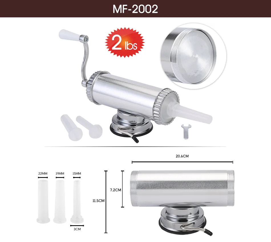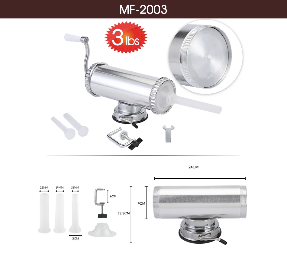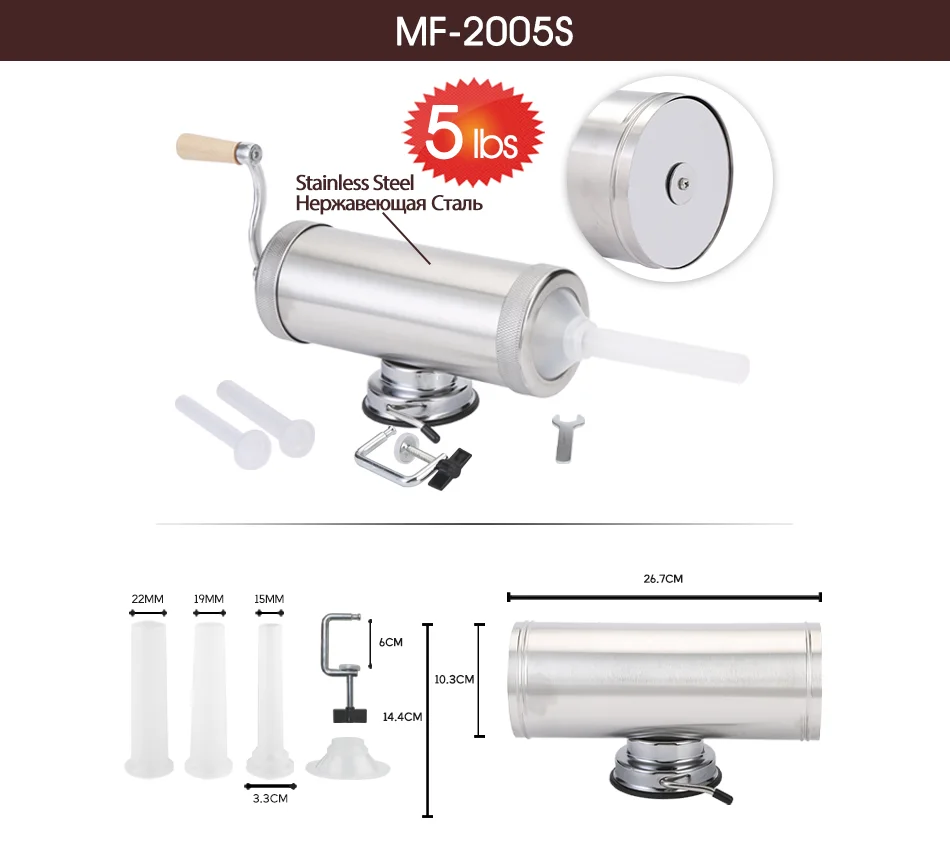 【 3 различных размера колбасных туб 】этот колбасный Производитель поставляется с 3 размерами колбасная трубка для начинки 15 мм, 19 мм и 22 мм для вас, чтобы сделать различные размеры колбас и Салам. 【Горизонтальная и всасывающая основа дизайн наш Колбаса stuffer разработан с горизонтальной, это значительно экономит труда. И прочная основа для обеспечения стабильности во время изготовления колбас. 【 2,5 кг Ёмкость для homemade】with 5 фунтов Ёмкость, вы можете наслаждаться свежий колбасы с вашей семьей и друзьями в трапезу. 【Простая ручная работа 】вы можете поставить колбасный шприц на край гладкой рабочей скамьи или стола с помощью всасывающего основания, перематывать силиконовый поршень из цилиндра, чтобы положить в фарш через наполнение сопла. Затем, повернув кривую ручку по часовой стрелке, ваши прекрасные свежие сосиски готовы в течение нескольких минут. 【Disassemable & Ручная стирка only】вы можете удалить все поворачивающиеся части и воронку после каждого использования. Промыть шприц горячей водой, а затем высушить.