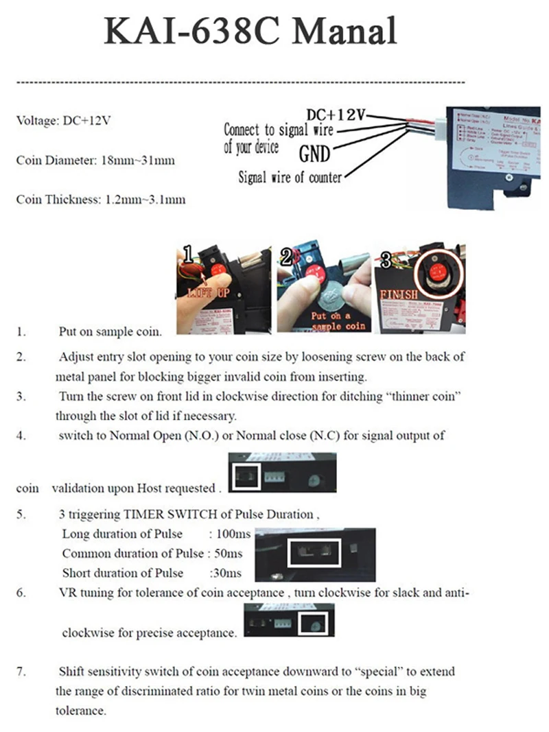 7. Переключатель нормального открытия и нормального закрытия для выхода сигнала проверки монет.