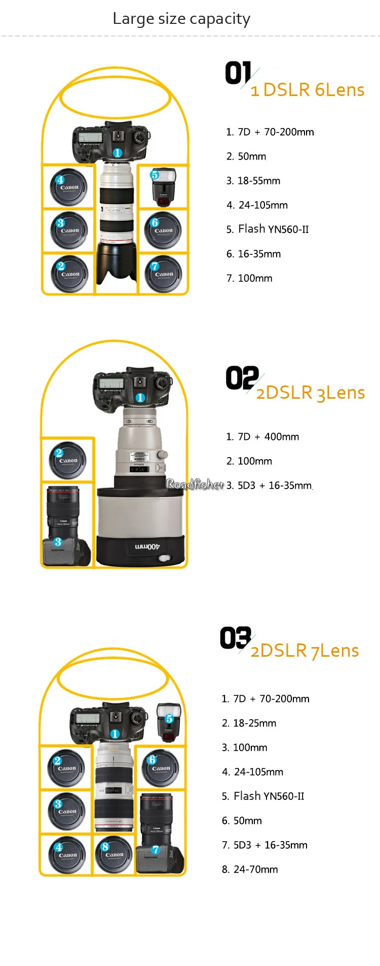 Большая емкость, можно поставить 2 DSLR + 7 объектив + аксессуары!