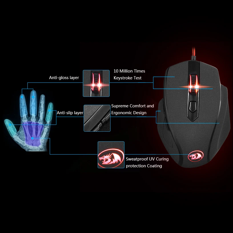 5 DPI OPTIONS & CUSTOMIZED FUNCTION – 5 adjustable DPI levels (500, 1000, 2000, 3000, 5000) meet your multiple needs, either for daily work or gaming. DPI can be adjusted freely by ±100 from 100 to 10000, taking advantage of on-the-fly DPI switching to instantly match mouse speed to gameplay demands. Besides, the Mouse Point Speed setting in the software also allows you to mildly change the movement speed of the mouse to achieve the best fit mode for yourself. 6 PROGRAMMABLE BUTTONS & 16-MILLION COLOR BACKLIGHT “BREATHING” RGB LED –6 (6 out of 7) programmable buttons enable superior productivity and efficiency to meet all your gaming needs. 5 memory profiles each with a dedicated light color for quick identification and 16-Million Color backlight 'breathing' RGB LED gives out ambient light and set you in a unique gaming atmosphere. COMFORT & PRECISION AT YOUR HANDS – The M709 TIGER gaming mouse is an essential computer accessory for die-hard gamers with its aggressive design for hands! You will be amazed by the unmatched comfort, lethal accuracy and killer precision of our durable, desktop and laptop pro gaming mouse! You can enjoy a wonderful clicking experience without disturbing others. It is an optimal choice in the office, library, dormitory or wherever you like. A PROFESSIONAL PROGRAMMING SOFTWARE – Our premium gaming mouse is the ultimate solution for most type of games. With the official & professional software included in the CD, you can set programmable buttons, customize DPI, Polling Rat, Mouse Point Speed and Multi-Combination keys(max: 19-keys-combination)for the right balance of accuracy and precision you so much desire. THE CHOICE OF DIE-HARD GAMERS –Whether you are targeting, aiming, slashing or attacking, a professional gaming mouse is your best weapon! The mouse will be your ideal partner. Perfectly compatible with Windows XP/Vista/Win7/Win8/Win10/ME/2000/Mac10.x, etc. The Redragon M709 Tiger Gaming Mouse is outfitted with 10000DPI High Precision Laser Sensor that shifts the balance between the keyboard and mouse with as well as 5 Savable Memory Profiles. Features: DPI can be adjusted freely by ±100 from 100 to 10000. Professional gaming mouse with 6 programmable buttons and switches enable superior productivity and efficiency to meet all your gaming needs. Powerful drive: Assign customized action to most buttons to achieve combo keys. Click times and delay times of key can be set. 3 Light modes: Full Lighted, Breathing, Flash. 16-Million Color backlight 'breathing' RGB LED gives out ambient light and set you in a unique gaming atmosphere. Compatible: Windows7/8/10/XP, Vista7/8,Mac OX and Linux operating system Specification: Customize DPI Switch mode 1: 500/1000/2000/3000/5000 adjusted via the buttons of the mouse Customize DPI Switch mode 2: DPI can be adjusted freely by ±100 from 100 to 10000 via programming software Polling Rate: Up to 1000 Hz; switchable: 125HZ/250HZ/500HZ/1000HZ(Default 500HZ ) Buttons: 6 (6 out of 7) are customizable Tracking System: Optical Interface: USB 2.0 full speed. 3.0 Working Voltage/Currency: DC5V / 100mA Size: 4.9 x 3.4 x 1.6 inches USB Length: 1.8M braided-fiber cable Package List: 1 X Redragon M709 TIGER Gaming Mouse 1 X CD 1 X User Manual