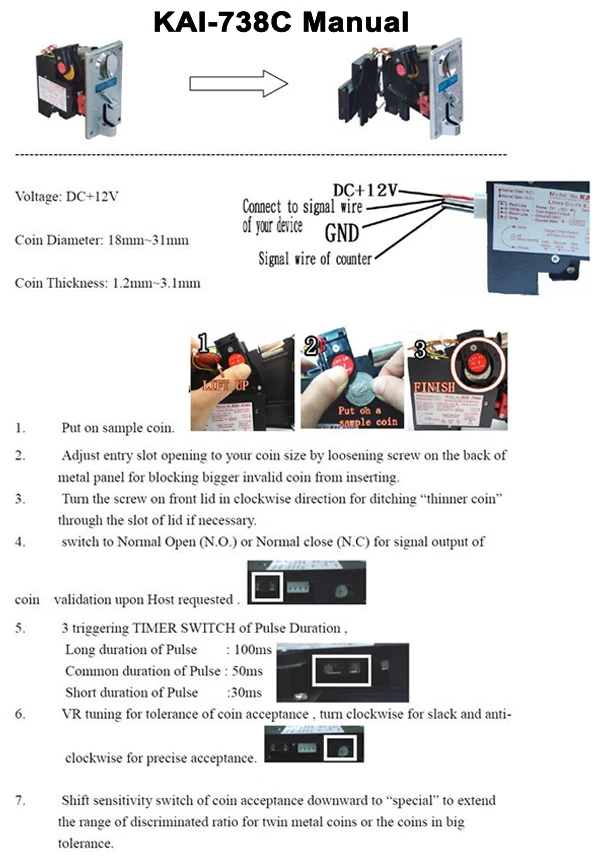 7. Переключатель нормального открытия и нормального закрытия для выхода сигнала проверки монет.