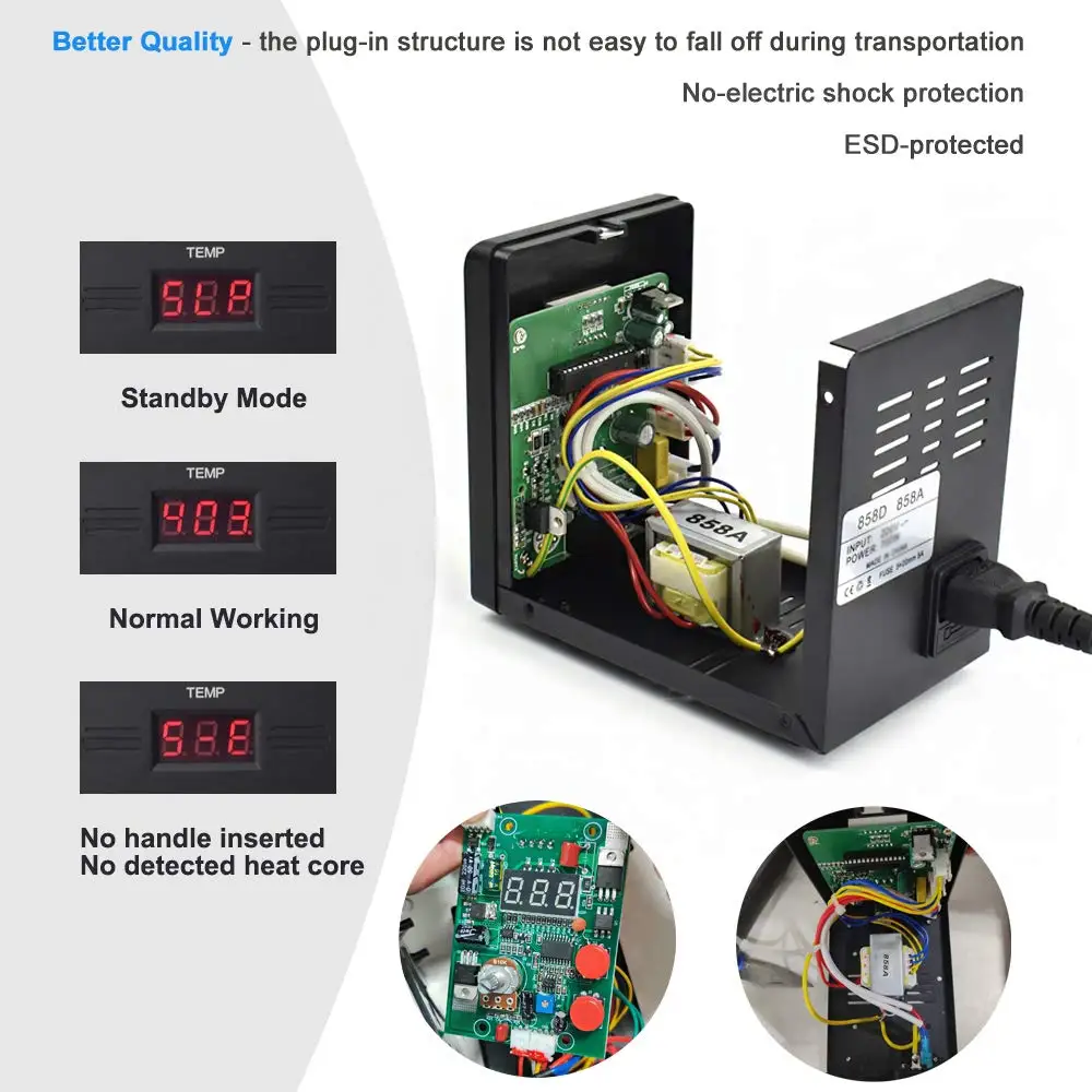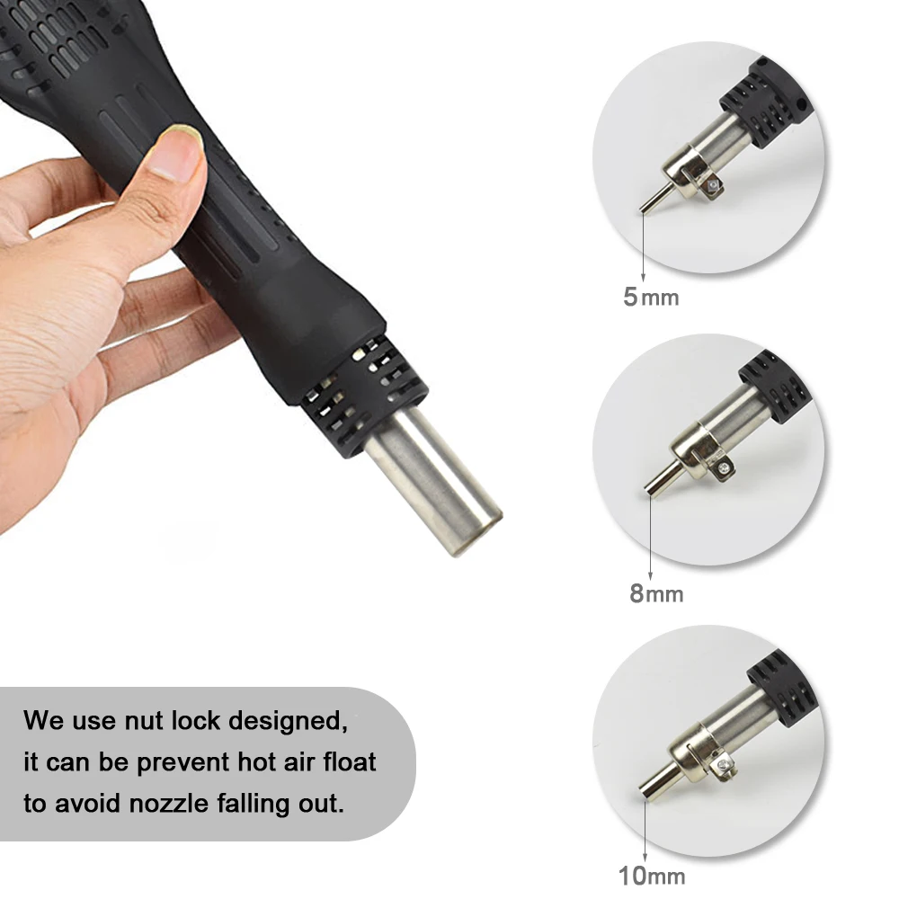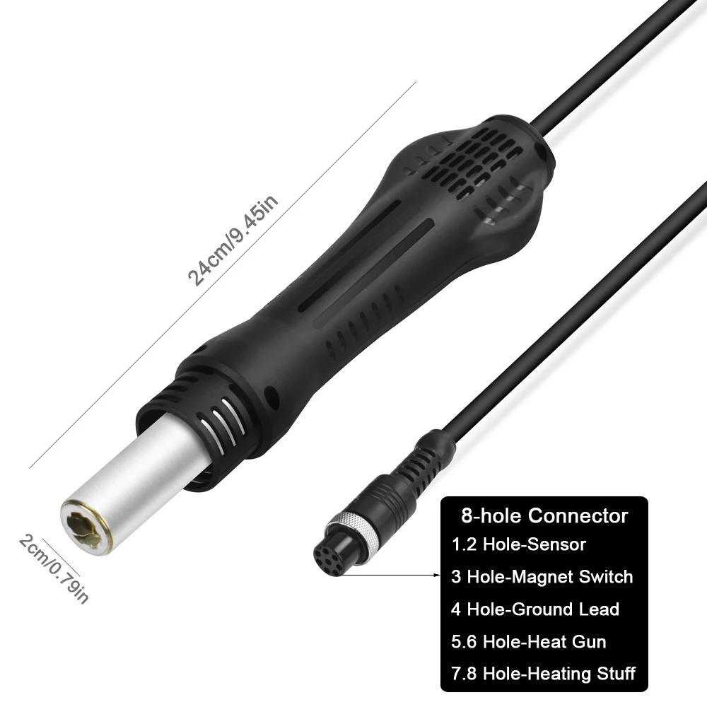Благодаря ручке есть прецизионный горизонтальный датчик, когда вы берете в руки, трубка сопла вверх, Пистолет автоматически переходит в резервную модель. Когда температура меньше 100 градусов, экран дисплея (---), оборудование находится в режиме ожидания, после температуры нагревательного элемента меньше 70 °, он автоматически остановит вращение, он используется для защиты жизни горячего воздушного пистолета.