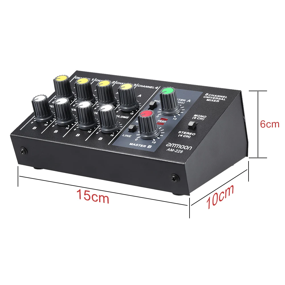ammoon AM-228 Ultra-compact Low Noise 8 Channels Metal Mono Stereo Audio Sound Mixer with Power Adapter Cable