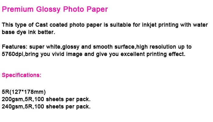 100% чистая древесная масса, Высококачественная бумажная основа, супер белая глянцевая фотобумага, хорошо подходит для цветной струйной печати.