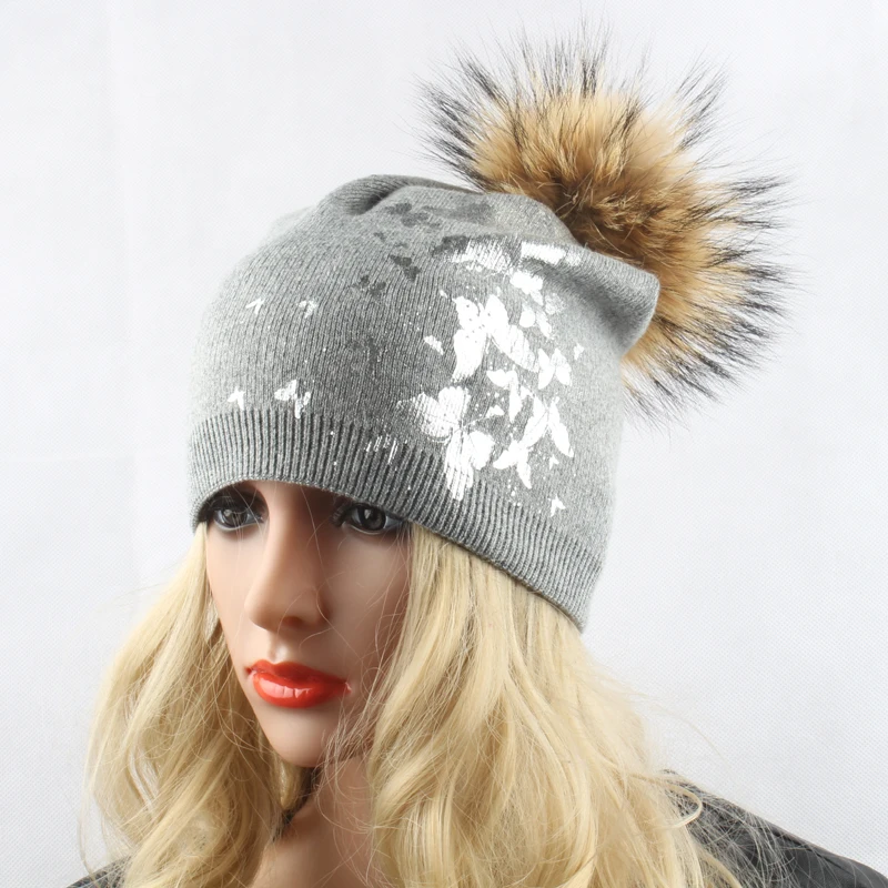 Зимние меховые шапки для женщин, женская шерстяная вязаная шапка с принтом бабочки, шапка с меховым помпоном Skullies