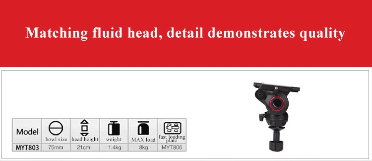 Тип:Профессиональная Головка камеры Модель:Головка MYT803 Процесс:Точная ковка Материал:Алюминиевый сплав Высота верхней точки: 22,5См Вес головы:1,4 кг Нагрузка:8 кг Диаметр основания:75 мм Адаптер штатива:Штатив/монопод с железной башней Характеристика: Головка жидкости MYT803 включает плоское основание, шариковую головку 75 мм и регулируемое Демпфирование; Платформа чаша база передачи всех видов головы свободно; 65 мм/75 мм/100 мм база может передавать свободно; Удлиняющая быстрая плата делает камеру более стабильной.