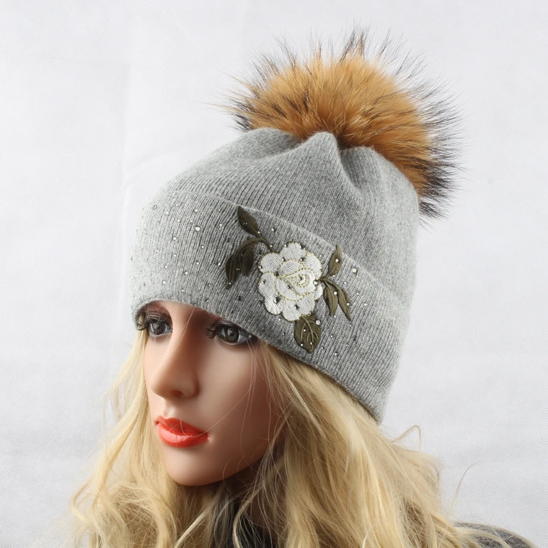 Женская шерстяная вязаная шапка, шапка с помпоном из меха норки и вышитыми розами, для зимы