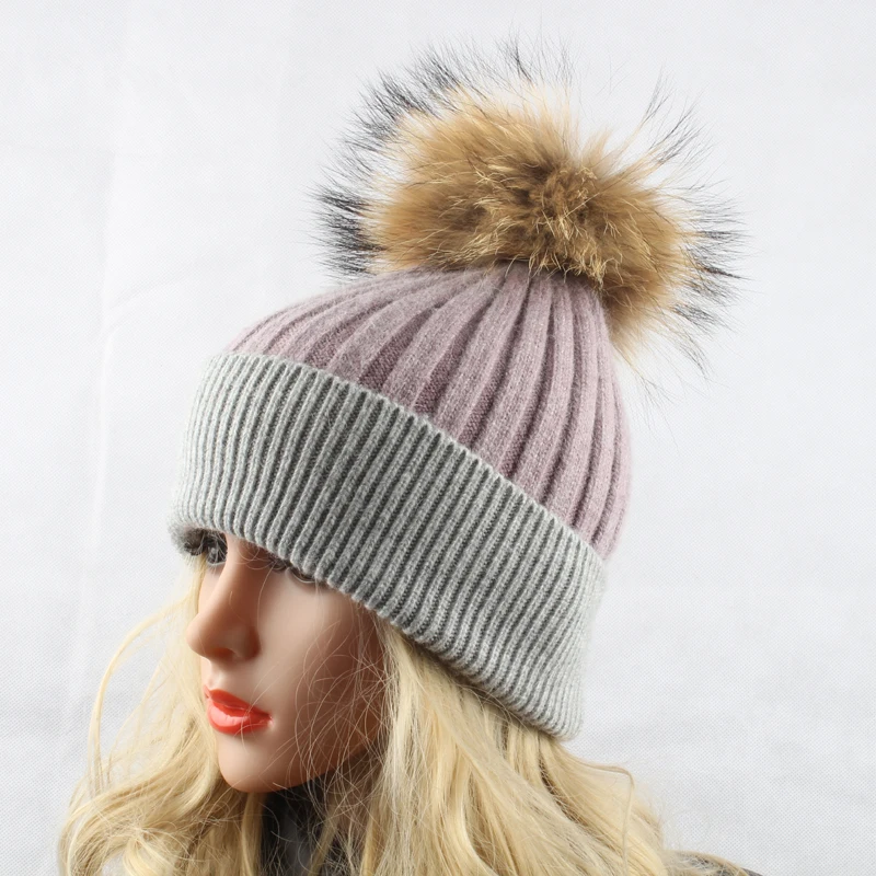 Зимние шерстяные шапки для женщин, меховая шапка с помпоном, Дамский мяч из натурального меха енота, вязаные кашемировые шапочки