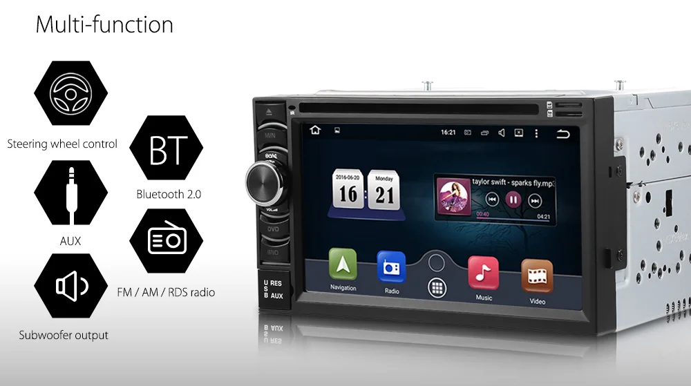 -Многофункциональность: FM/AM/RDS функция радио, управление рулем, функция выхода сабвуфера, разъем входного разъема AUX