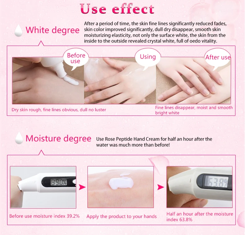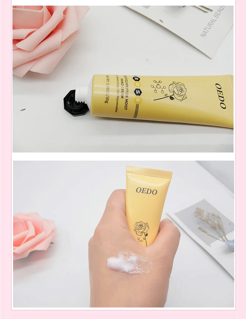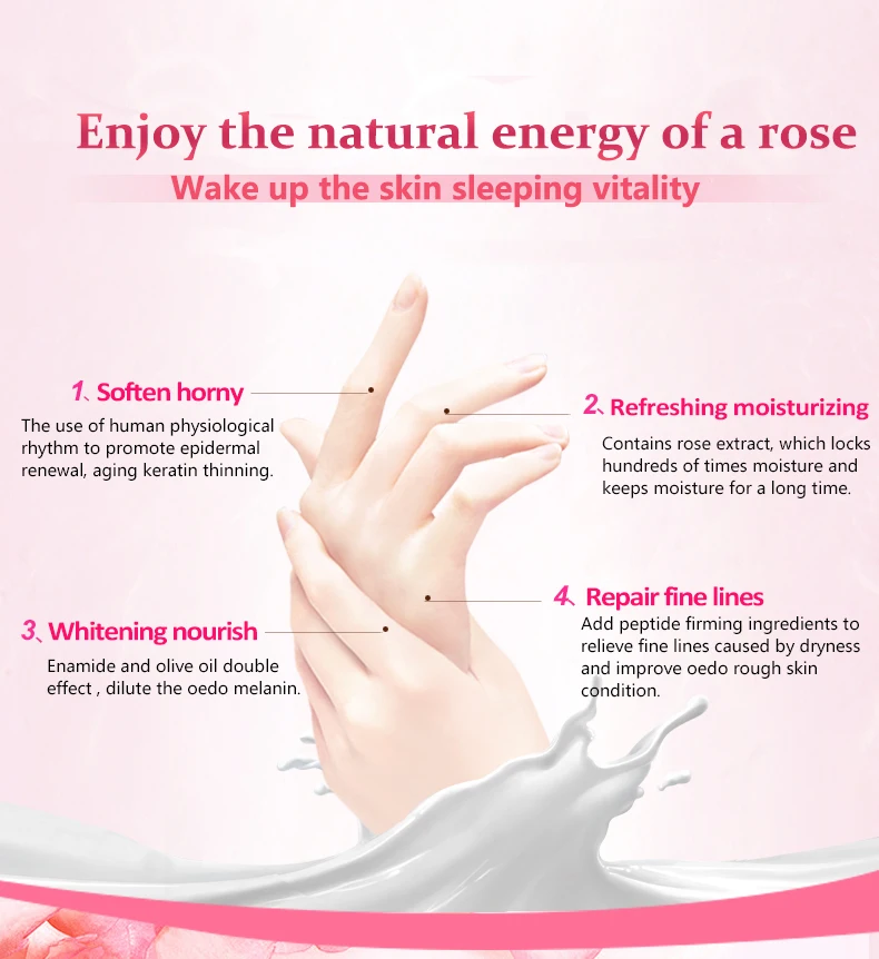 Характеристики продукта: экстракты розы, тщательное пополнение, увлажнение блокирует воду, мягко защищает кожу рук; Добавляют пептидные укрепляющие ингредиенты, снимают сухие и тонкие линии, вызванные сухостью, улучшают состояние увлажнения кожи; влажная Защитная мембрана на поверхности кожи, потерю влаги нелегко, тщательное увлажнение кожи, Вытрите блестящие гладкие руки.