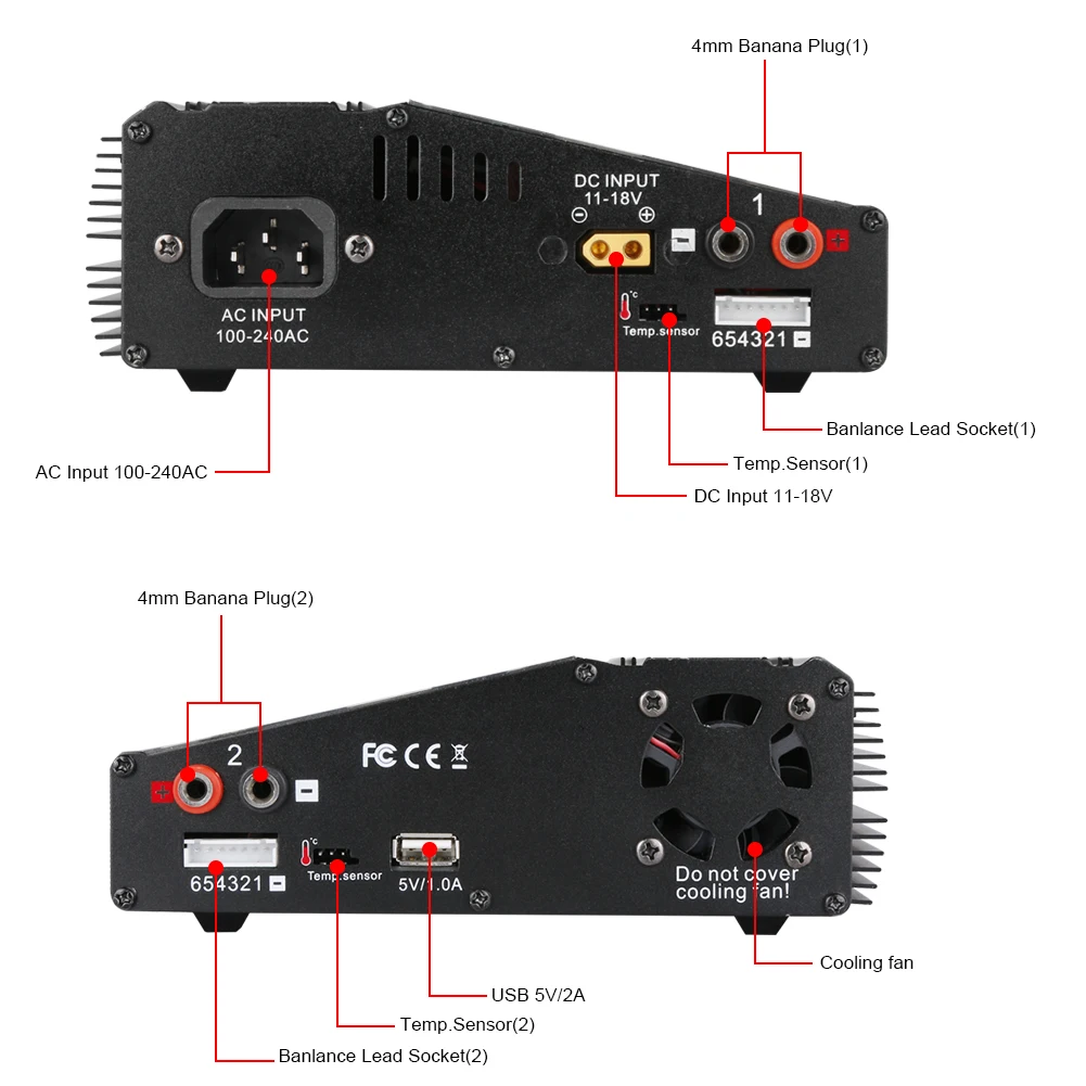 Особенности: > 2 независимых выхода, пользователь может заряжать 2 различных вида батареи одновременно > Практичный для различных аккумуляторов 1-6S Lilon/LiPo/LiFe/LiHV, 1-15 ячеек Nicd/NiMh, 2-20 в PB батареи. Умный аккумулятор I,II,III. > Многофункциональность: Балансировка заряда, разрядка, контроль напряжения терминала, проверка емкости литиевой батареи и напряжения, проверка внутреннего сопротивления батареи, калибровка напряжения отдельных элементов, хранение данных и загрузка, выход USB DC 5V 2.0A, > Использование rs может установить ограничение тока зарядки, ограничение емкости, порог температуры и ограничение времени обработки, что делает зарядное устройство безопасным для использования. > Встроенный вентилятор с хорошей системой охлаждения. Спецификация: Вход: AC 100-240 В/DC 11-18 в Режим зарядки переменного тока: порт 70 Вт 1/порт 50 Вт 2 Режим зарядки постоянного тока: порт 100 Вт 1/порт 100 Вт 2 Мощность разряда: 10 Вт Диапазон заряда: 0,1-10A Диапазон тока разряда: 0,1-2A Слив тока для балансировки: 400мА/ячейка LiHv/LiPo/LiIon/количество жизненных клеток: 1-6 ячеек NiCd/NiMH Количество ячеек батареи: 1-15 ячеек Pb Напряжение батареи: 2-20 в Умная Батарея: I/II/III