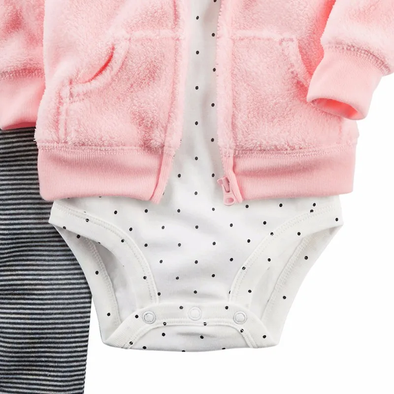 Изготовлен из плюшевого снежного флиса с уютным ухом животных, этот кардиган в комплекте идет в комплекте с мягким хлопковым Боди и брюками.