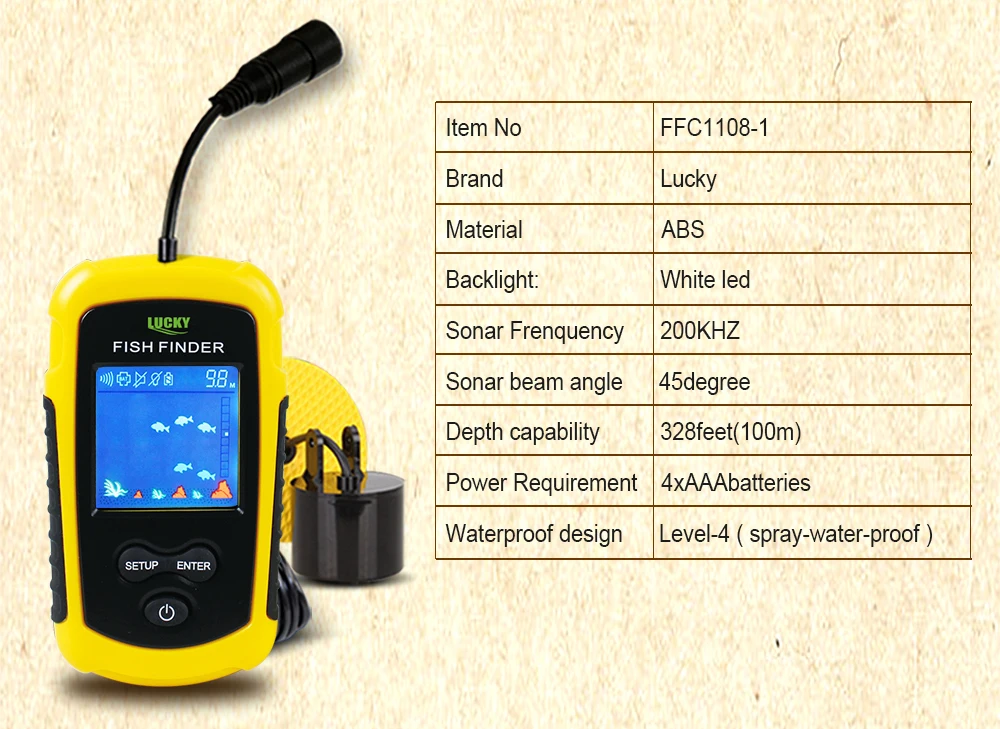 1) Дисплей: 2 дюйма TN/Anti-UV LCD 2) заднее освещение: Белый светодиодный 3) Глубина: 328 футов (100 м) 4) Требования к питанию: 4 щелочные батареи xAAA 5) Водонепроницаемая конструкция: уровень-4 (спрей-водонепроницаемый) 6) показать глубину воды, расположение рыбы, дно травы и скалы 7) выбираемая пользователем чувствительность, единицы измерения глубины и настройка сигнализации для рыбы 8) Рабочая температура: от 14F до 122F (от-10C до 50C)