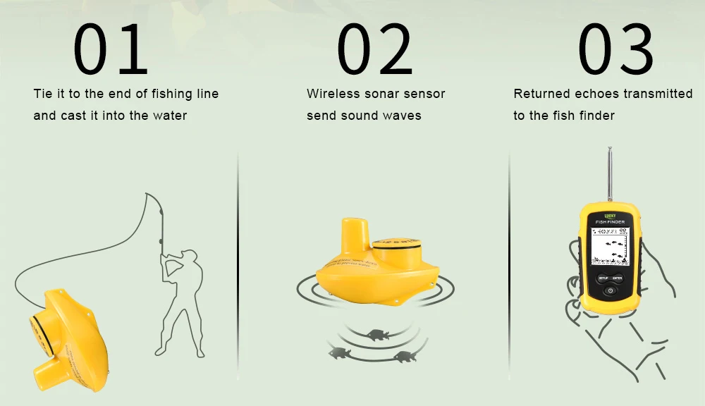 1. Привяжите его до конца лески и бросьте в воду 2. Беспроводной sonar Датчик посылает звуковые волны 3. Возвращаемые эхо передаются в рыболокатор