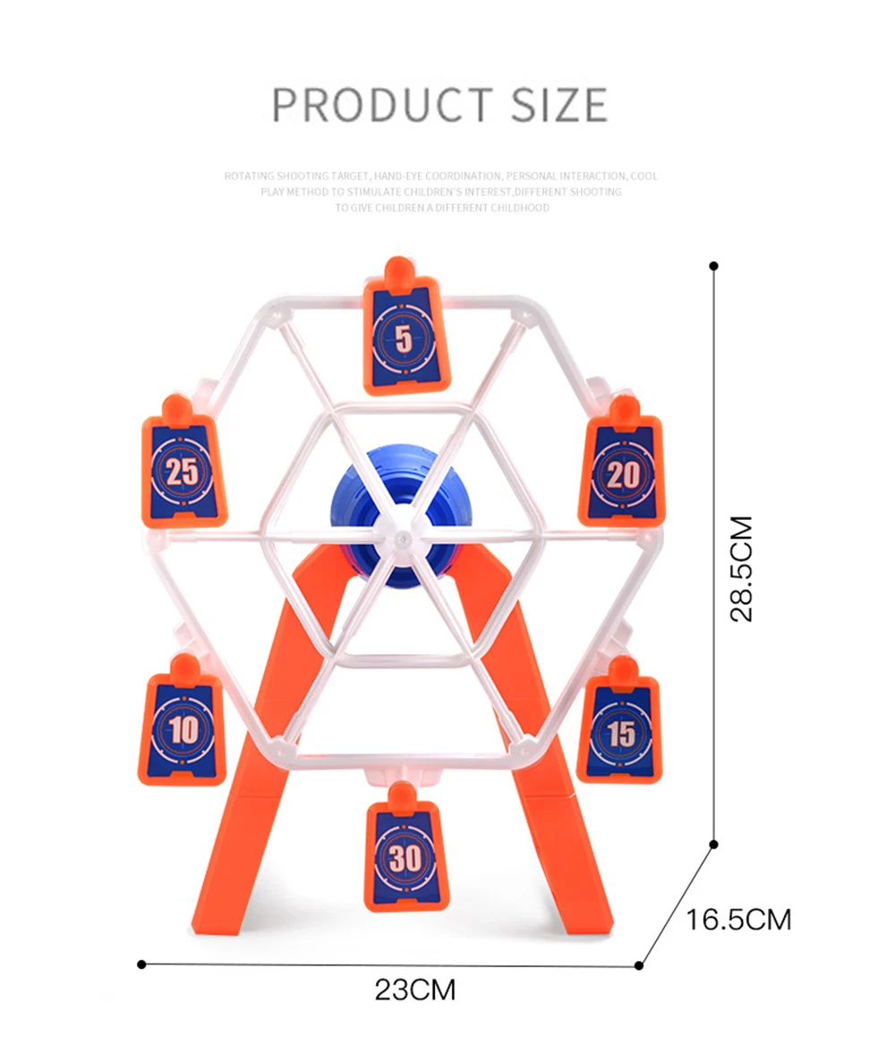 Описание: Специально разработан для быстрого и быстрого стрельбы, получить его и испытать острые ощущения от стрельбы и практиковать способность снимать. Есть взрыв! Как играть: 6 табло (5,10, 15,20, 25,30), снятие отметок, оценка Высокая для победителя. Особенности: 1. Изготовлен из высококачественного АБС-пластика, который не токсичен, безопасен для вашего ребенка. 2. Набор blaster оснащен колесной мишенью с вращающимся действием и потрясающим музыкальным эффектом, более сложной и веселой. 3. Эта игрушка позволяет вам испытать острые ощущения от стрельбы и практиковать способность снимать. 4. Помогает улучшить отношения между вашим партнером или ребенком. 5. Привлекательная внутренняя или открытая игра для ваших маленьких мальчиков и девочек. Спецификация: Режим питания: 3 * батарейки AA (не входят в комплект)