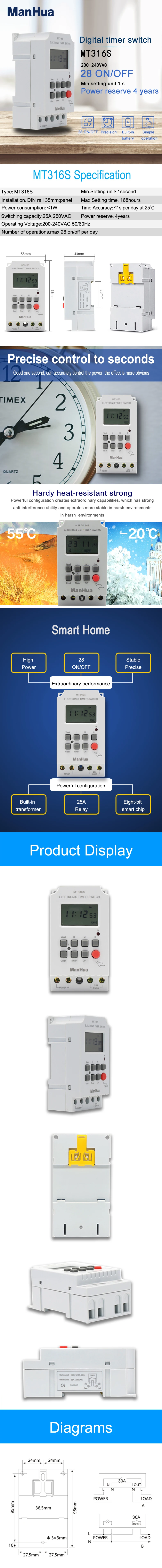 ManHua din-рейка 220VAC 25A MT316S программируемый электронный таймер для универсального электрического прибора цифровой таймер переключатель