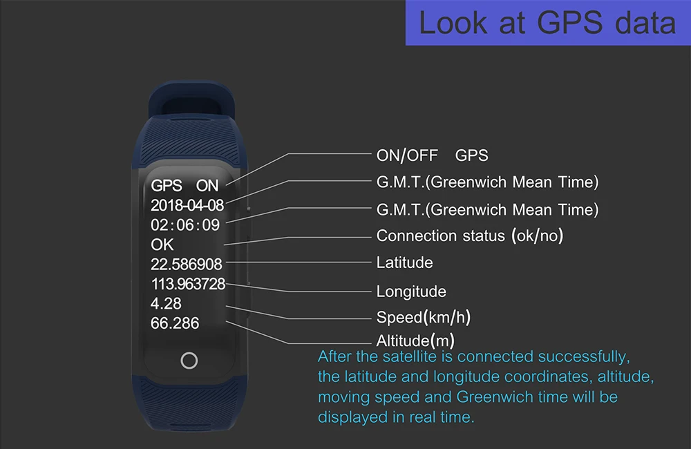 0,96 дюймовый TFT цветной экран, самосветящийся/низкое энергопотребление CPU скандинавский 52832, BT4.2 IP68 профессиональный уровень защиты, поддержка плавания (не поддерживает горячую ванну и водяной пар) 3,7 V/230 mAh полимерный литий-ионный аккумулятор, GPS время 5-7 h, общее время использования 120 h, время работы в режиме ожидания 480 h. Уведомления о звонках и сообщениях, поддерживает английский, русский, испанский, польский, французский, немецкий, итальянский, чешский, португальский, японский, корейский, китайский и т. д. Динамический тест на сердечный ритм: Профессиональный динамический датчик сердечного ритма, понимание в реальном времени состояния движения, 7x24 часов для мониторинга, браслет будет вибрировать, если Пульс превышает заданное значение. Независимый gps-трекер: важный нано-GPS чип, профессиональное тестирование данных может помочь вам заниматься спортом с научной точки зрения. Профессиональный датчик сбора данных: датчик G/датчик сердечного ритма, кривая браслета показывает тренд. Дополнительные характеристики: различные спортивные режимы (плавание, бег, езда на велосипеде, прогулки, альпинизм), динамический датчик пульса, GPS + ГЛОНАСС, траектория, Гравитационный датчик, темп/скорость, кривая данных, регулировка контрастности экрана, синхронизация времени, напоминание о сидячем положении, монитор сна, шагомер.