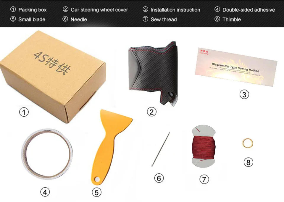Посылка включает в себя: кожаный чехол, иглу, нить, инструкции по установке, другие швейные инструменты.