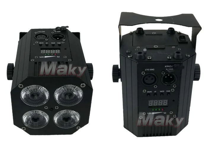 DMX512/ir Управление, master/slave, авто, звук активных Управление меню 4-х разрядный цифровой светодиодный дисплей Автоматическая модель (кнопкой функции) Изменение цвета, цвет строб, цвет диммер, Цвет постепенное изменение/прыгать изменения цвета Размер упаковки 165*160*203 мм Вес N.w: 1.5 кгGw: 1.8 кг
