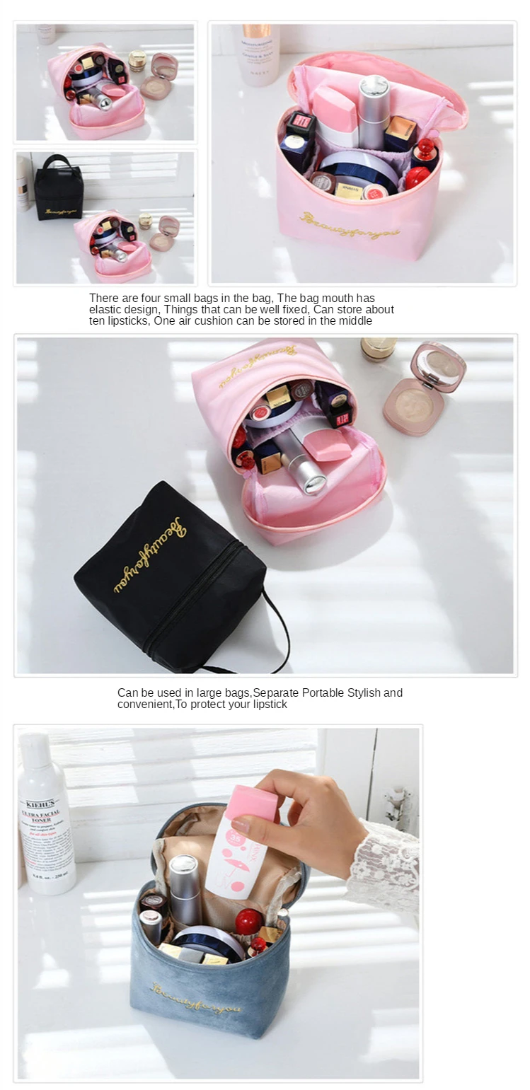 В сумке четыре небольших сумки, с эластичной конструкцией на кармане, которые можно использовать для хранения продукта хорошо. В ней можно хранить около десяти помад и воздушную подушку посередине.