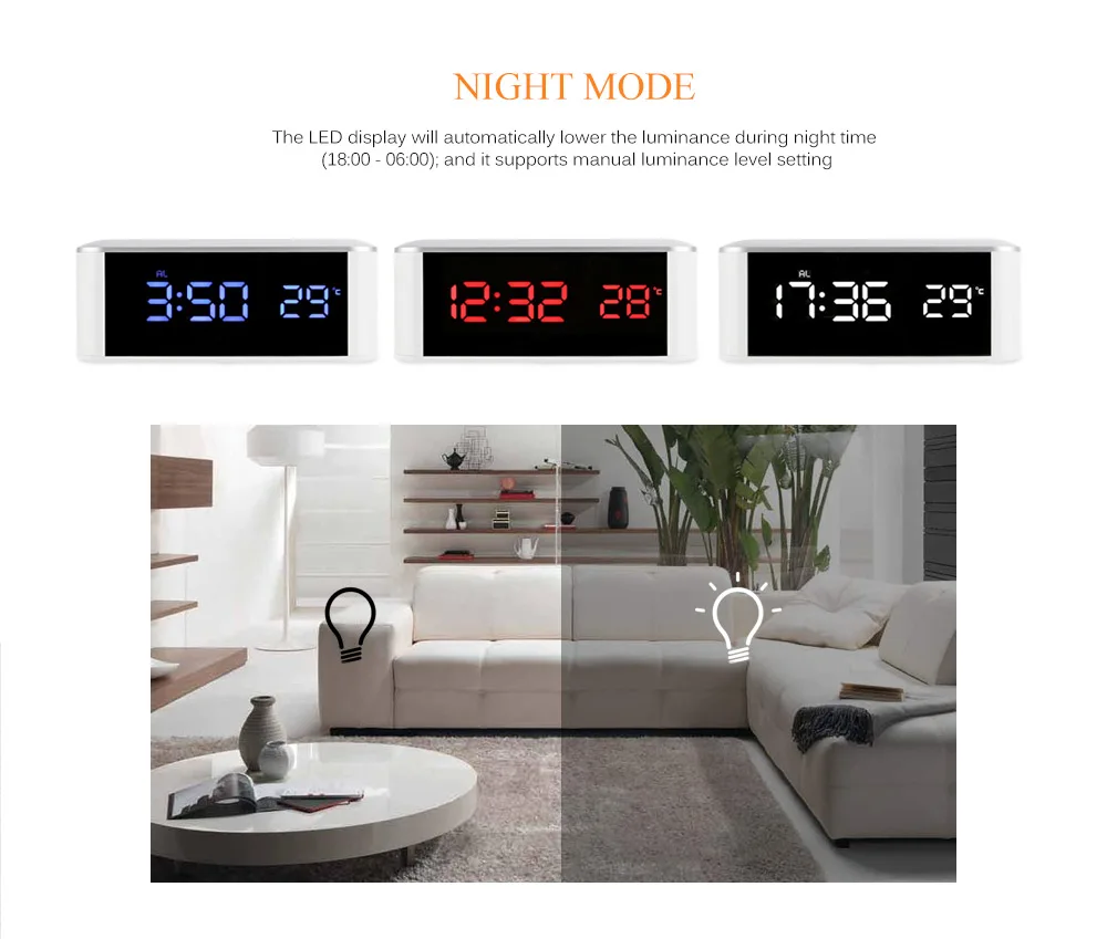 -Функция ночного режима: светодиодный дисплей автоматически снижает яркость в ночное время (18:00-06:00), и есть три уровня яркости