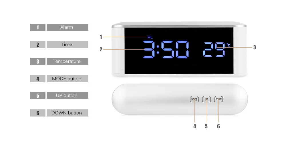 -Светодиодный дисплей (режим 12/24 ч) и температуры (по Фаренгейту и Цельсию)